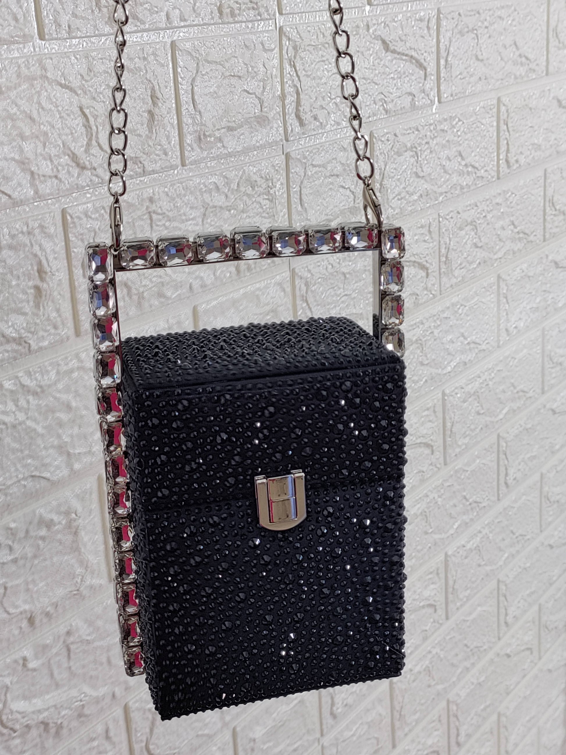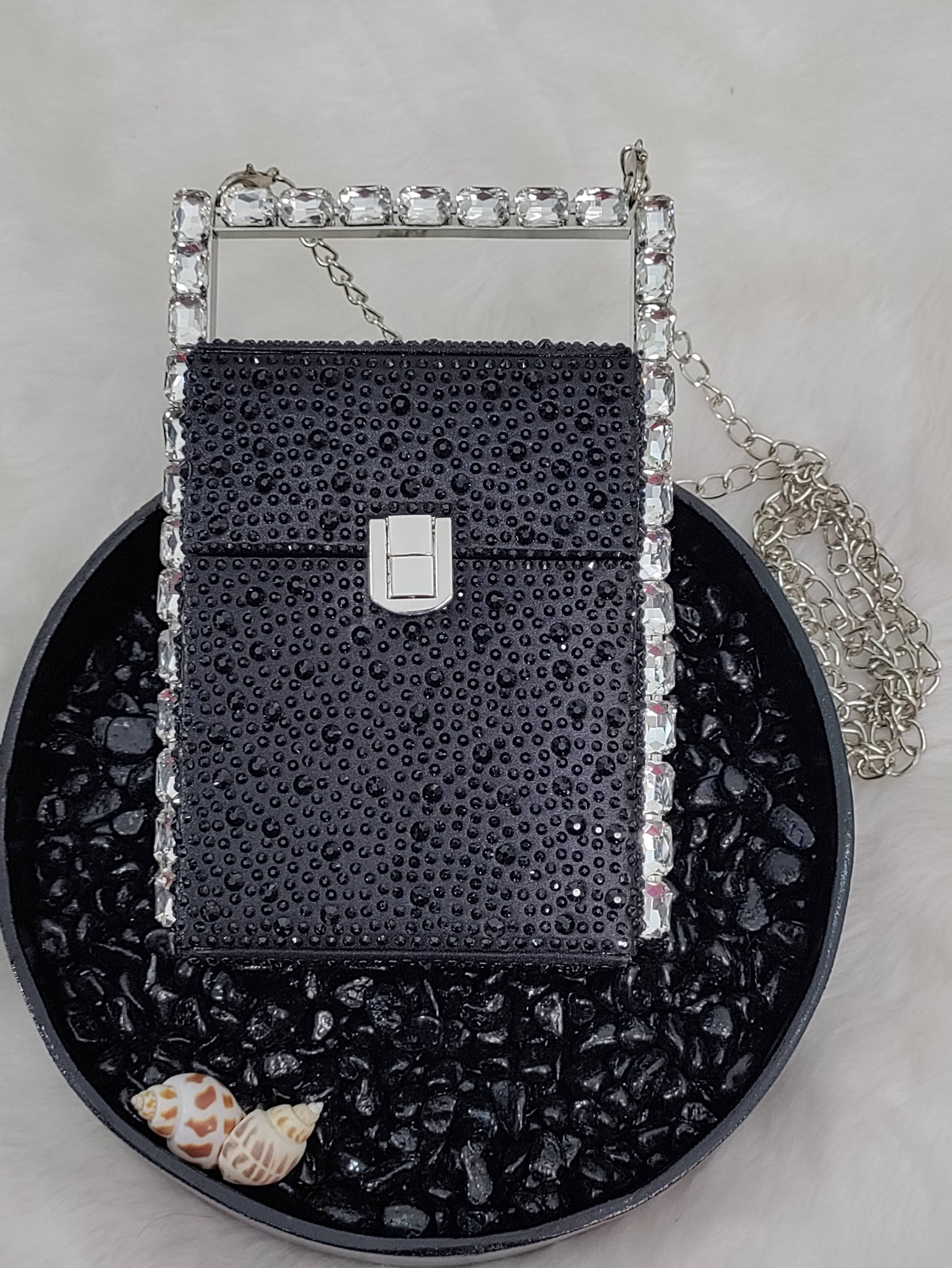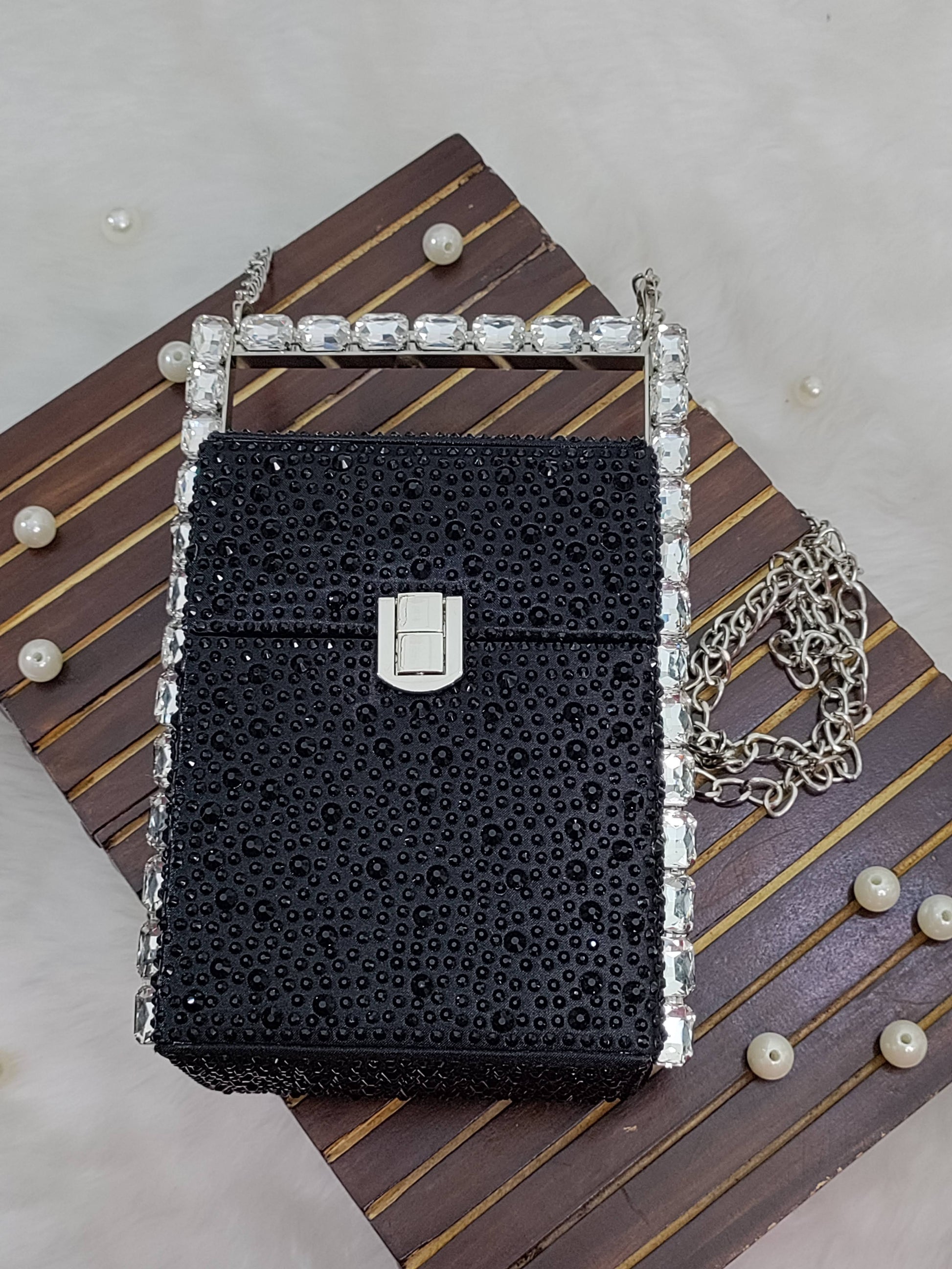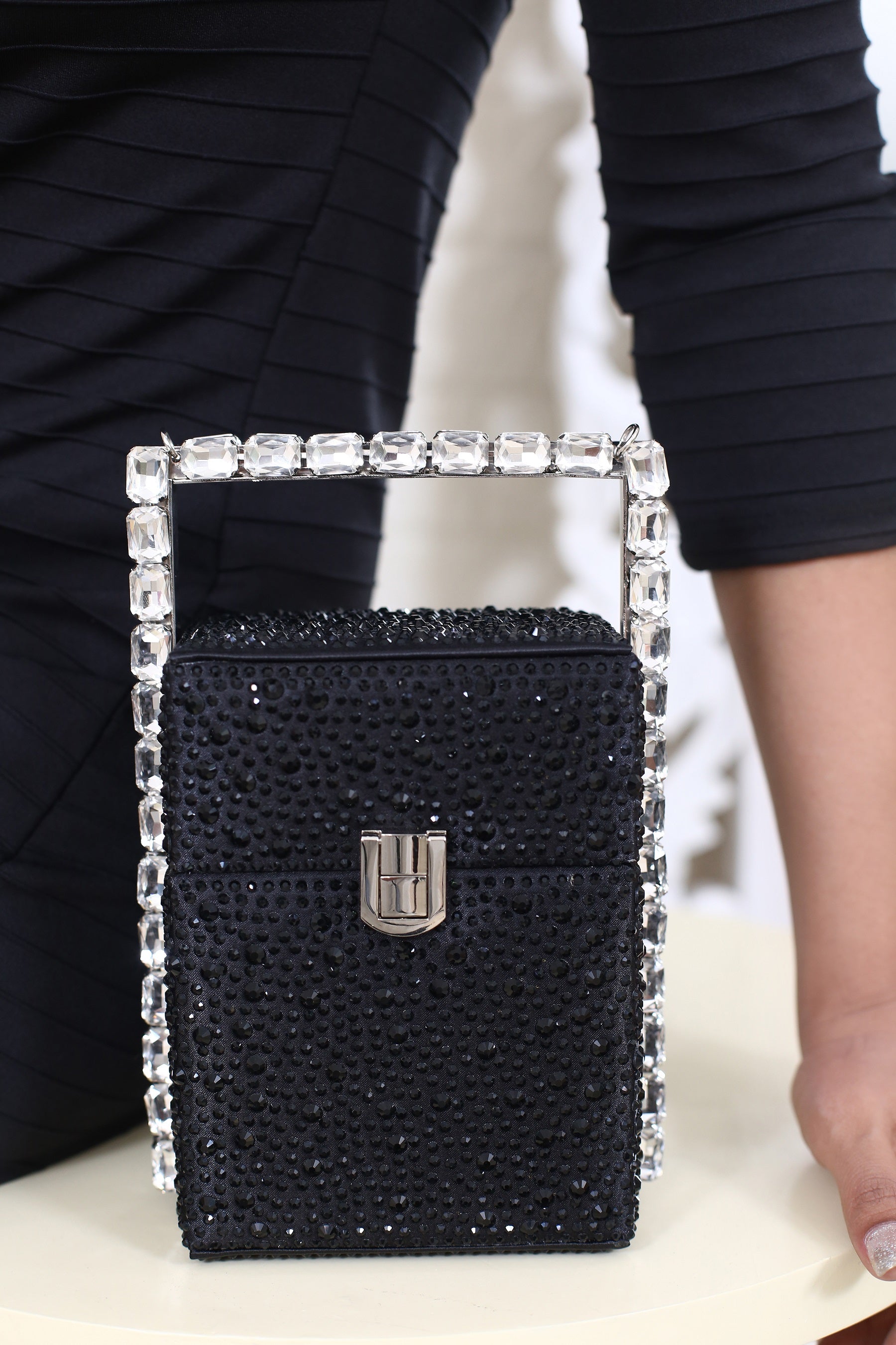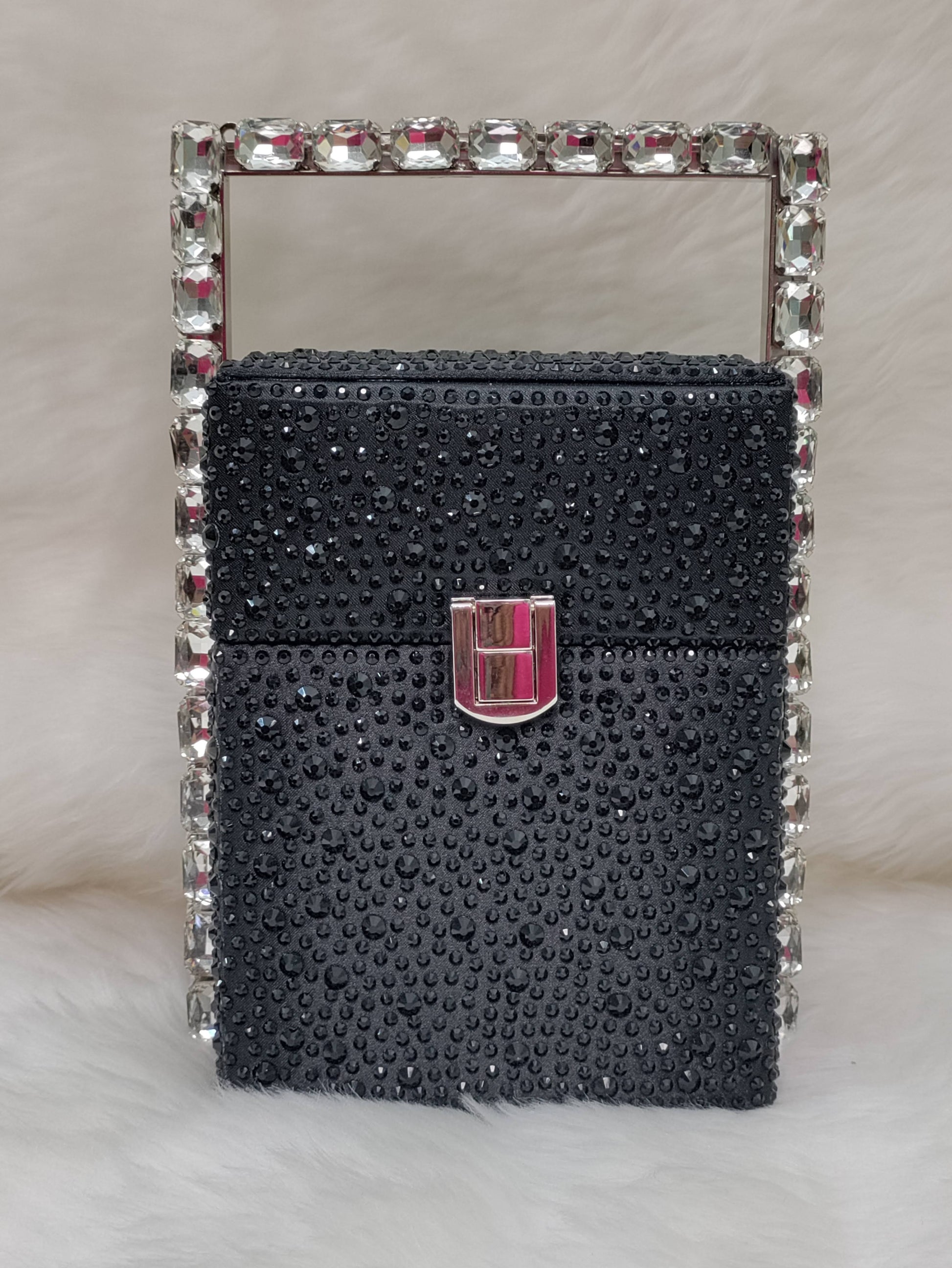 This sturdy square box bag with a sleek design and contemporary look. This luxurious bag is entirely crystal studded with a stunning stone handle. This bag is definitely an attention grabber.