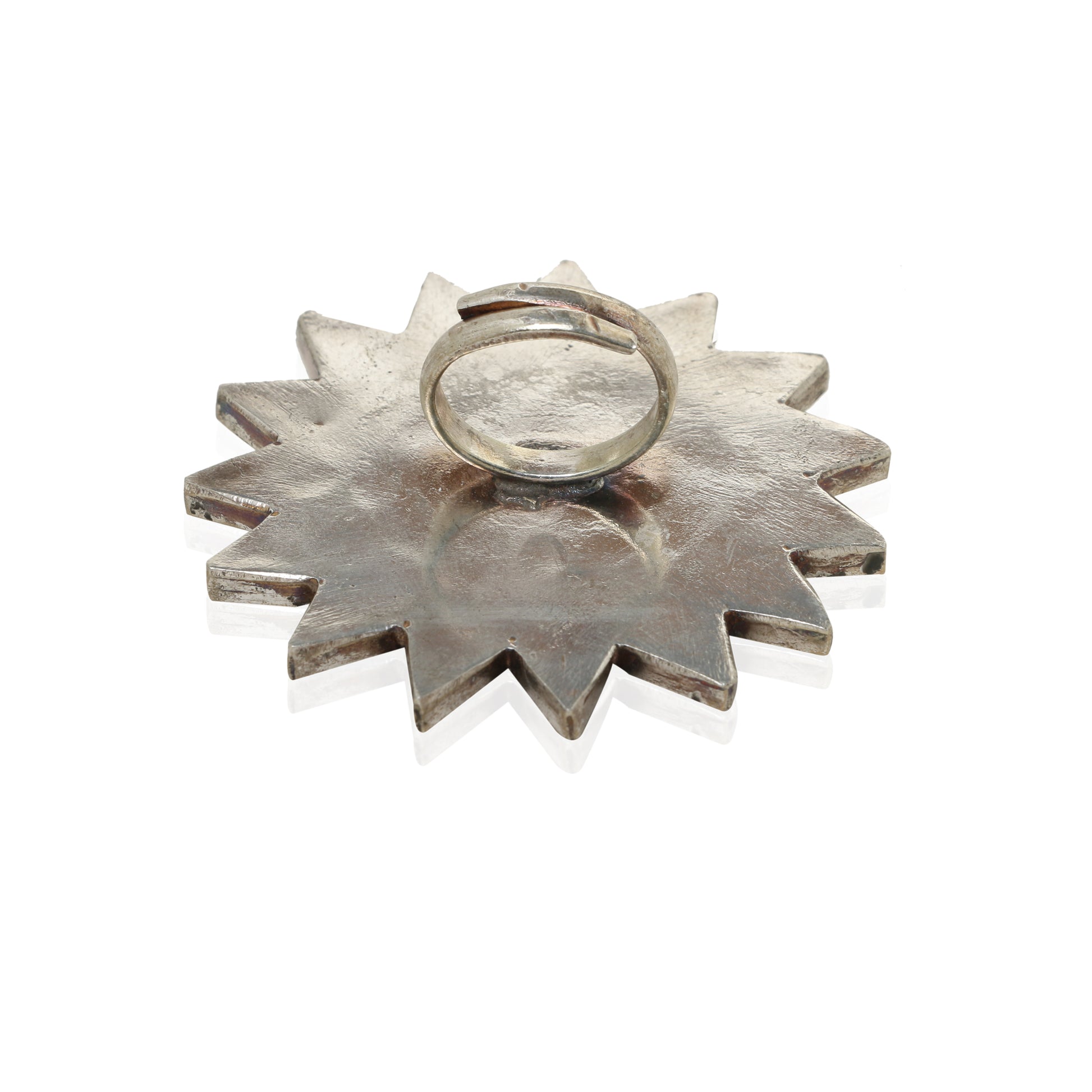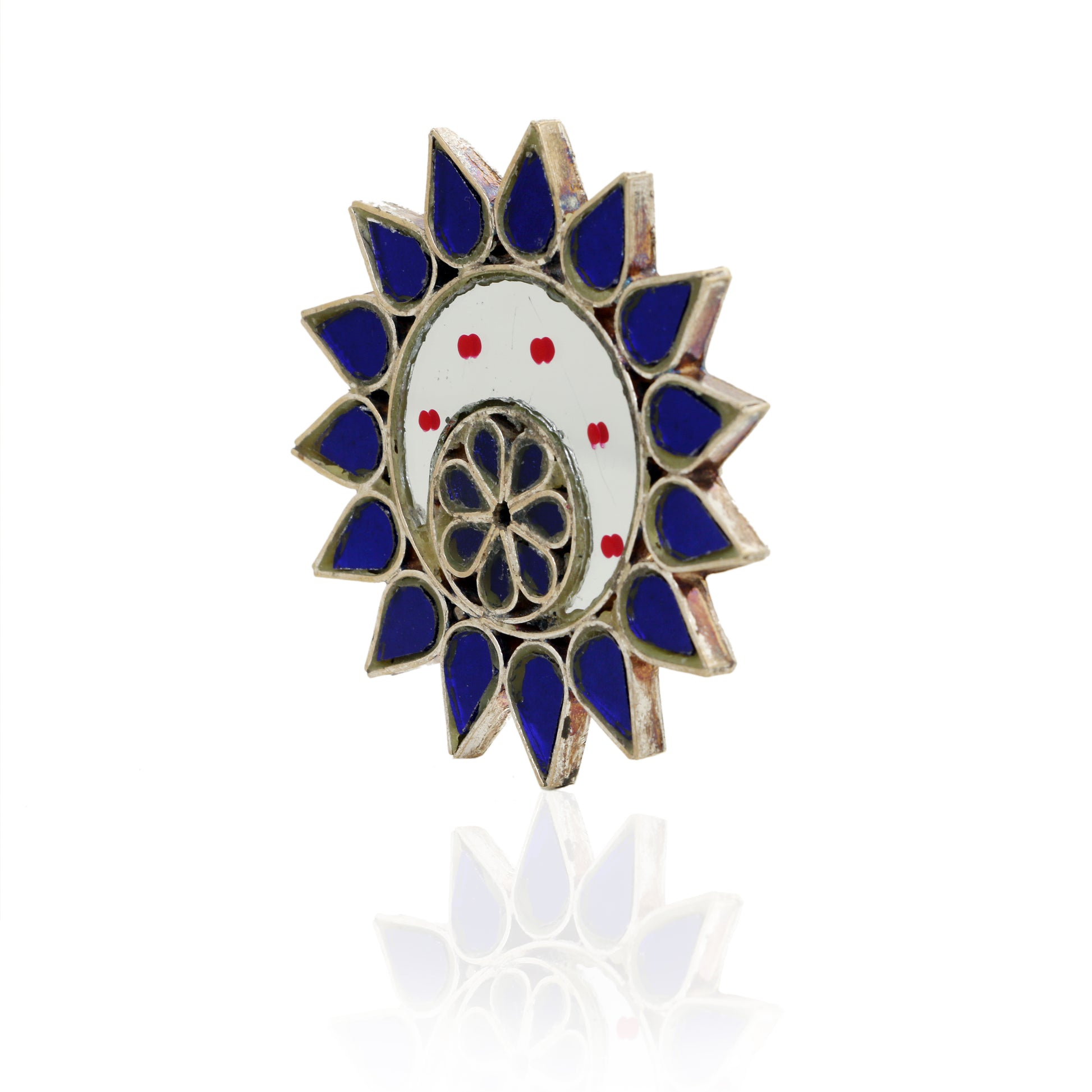 If you like to create a statement wherever you go, then this stunner of a ring is definitely for you. An ode to the skilled craftsmanship, this ring features melted meenakari work on it. The glass is individually hand cut to fit the metallic brass frame and then given a rustic finish for the final look.