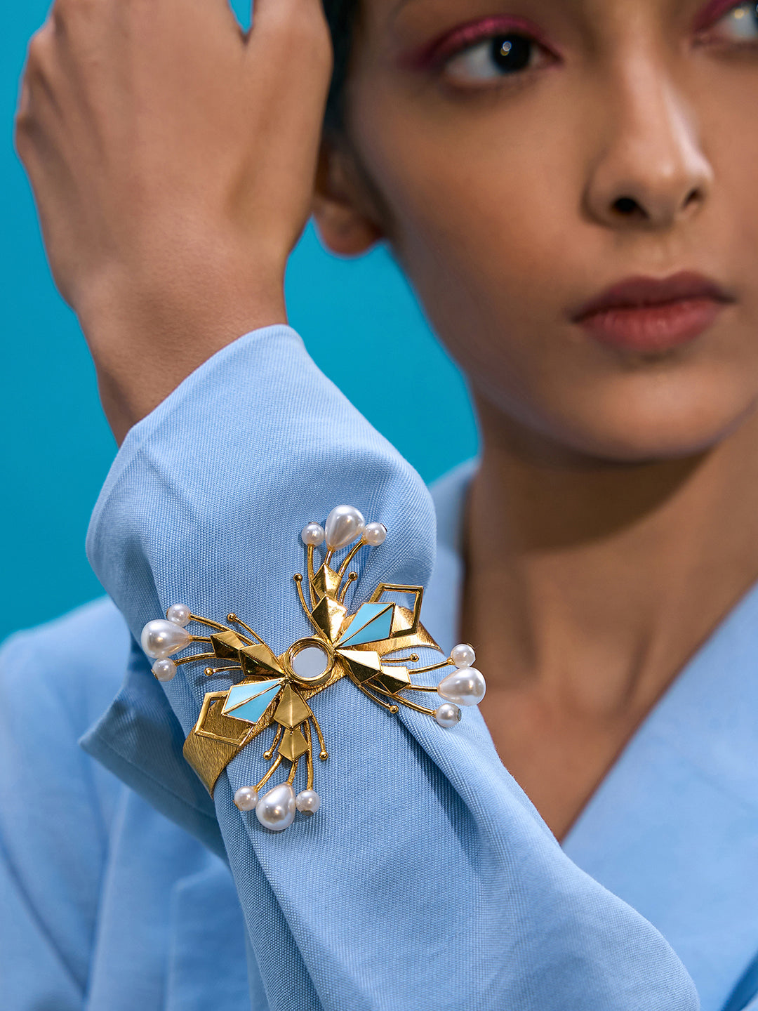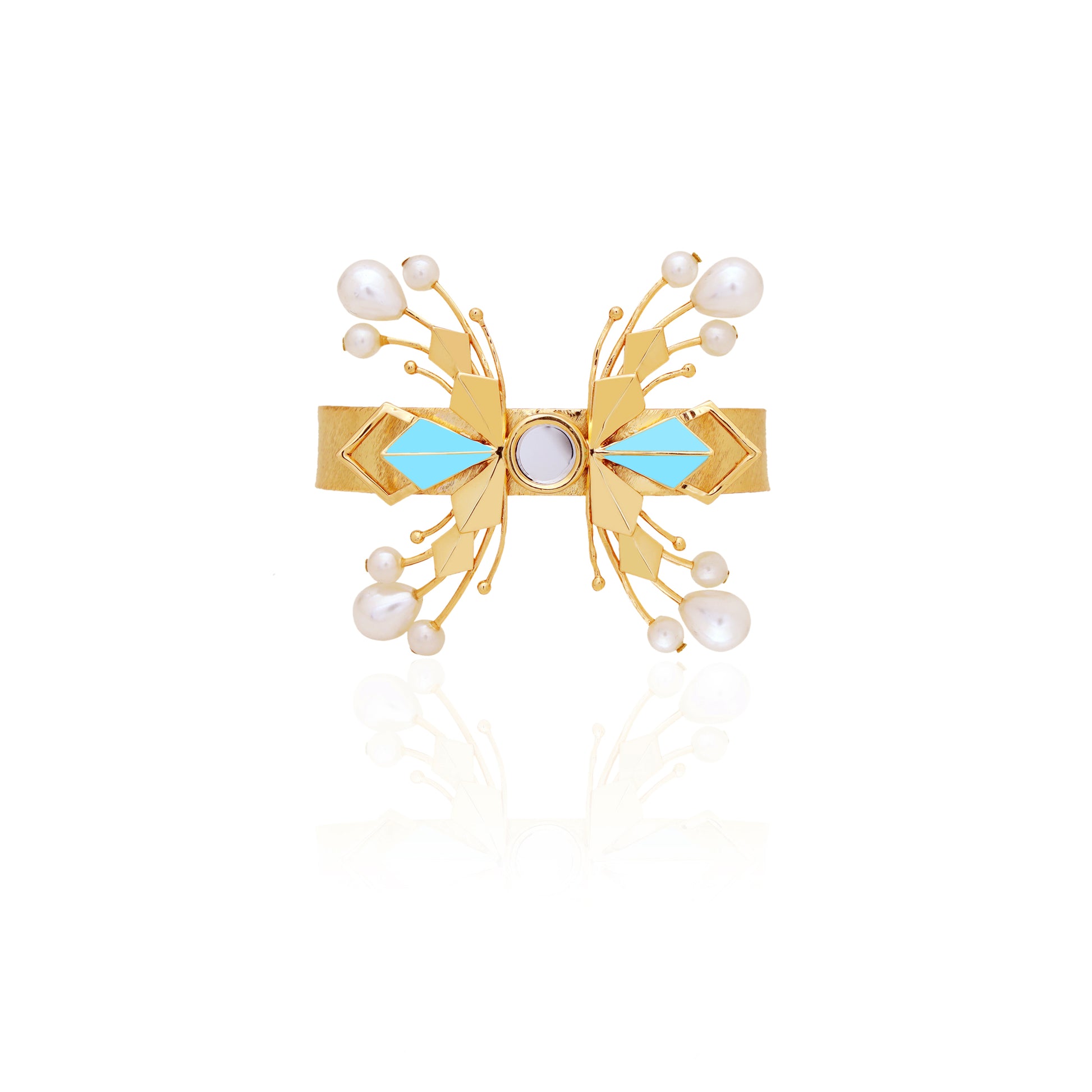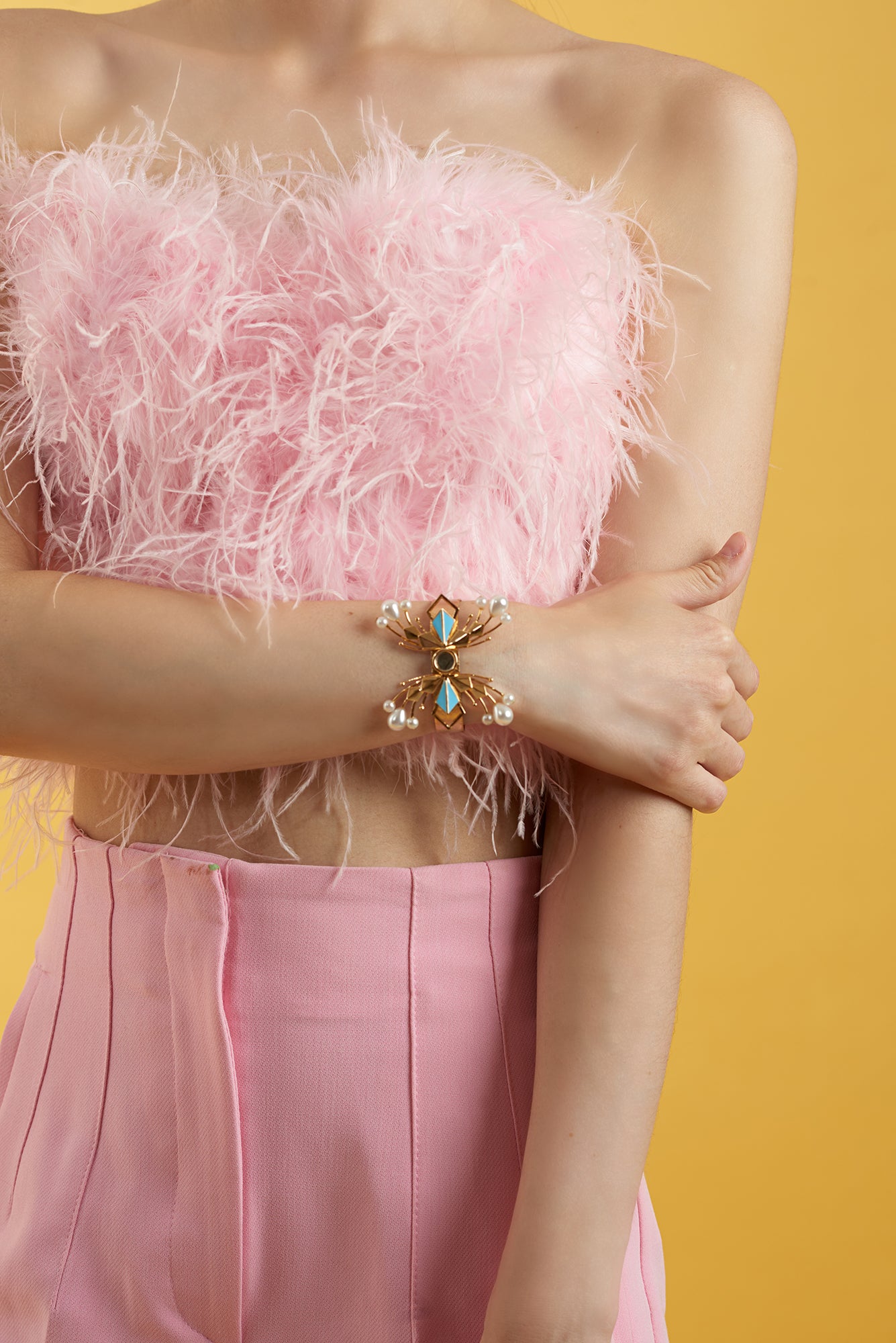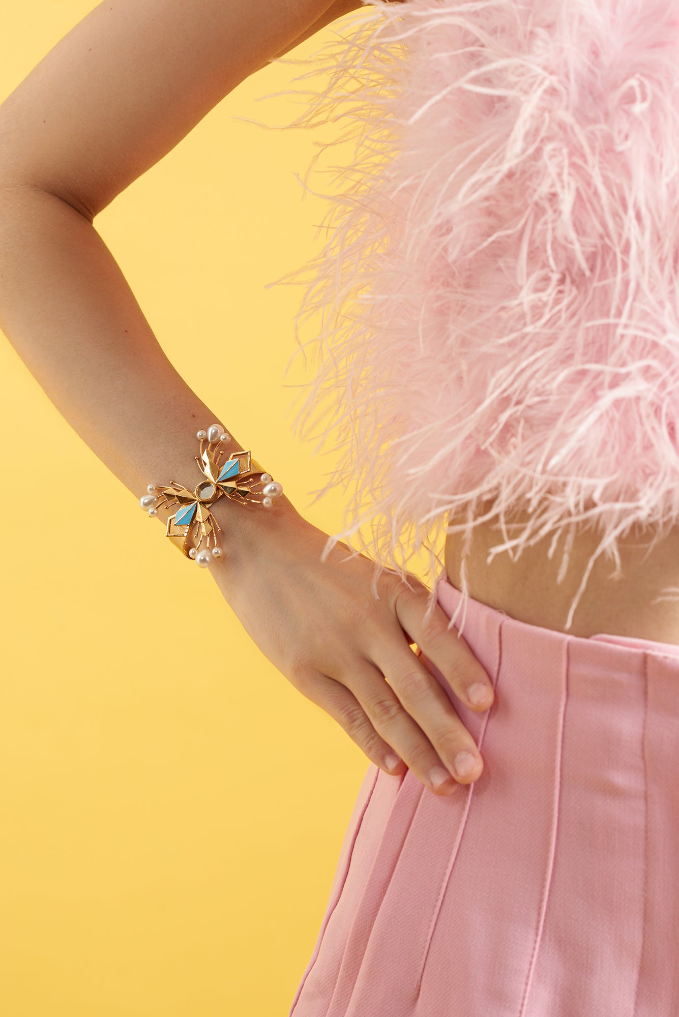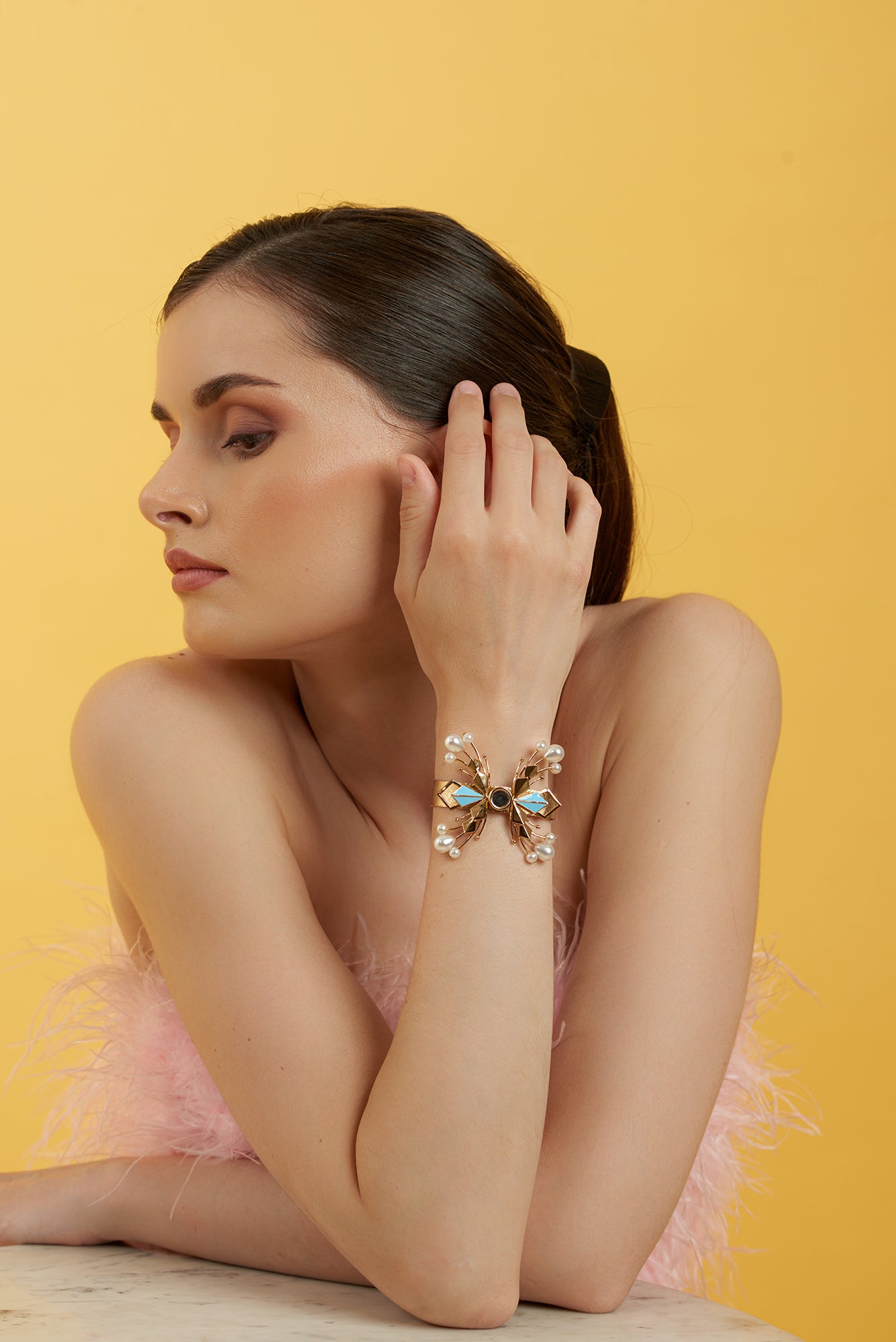Handcrafted To Gleaming Perfection Celia Timeless Is True Heaven For Your Wrist. 22K Gold Finish, RUHHEITE's This Tier Drop Pearl Bracelet Is Enchantingly Delightful For You. Perfect Change In Spice. Enabled Colour Petals With Mirror. Beautiful And Unique Design From Our New Collection Only For You.