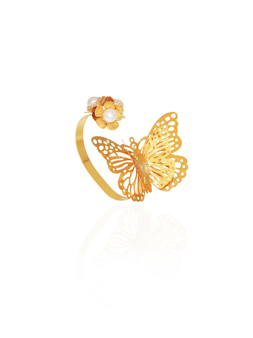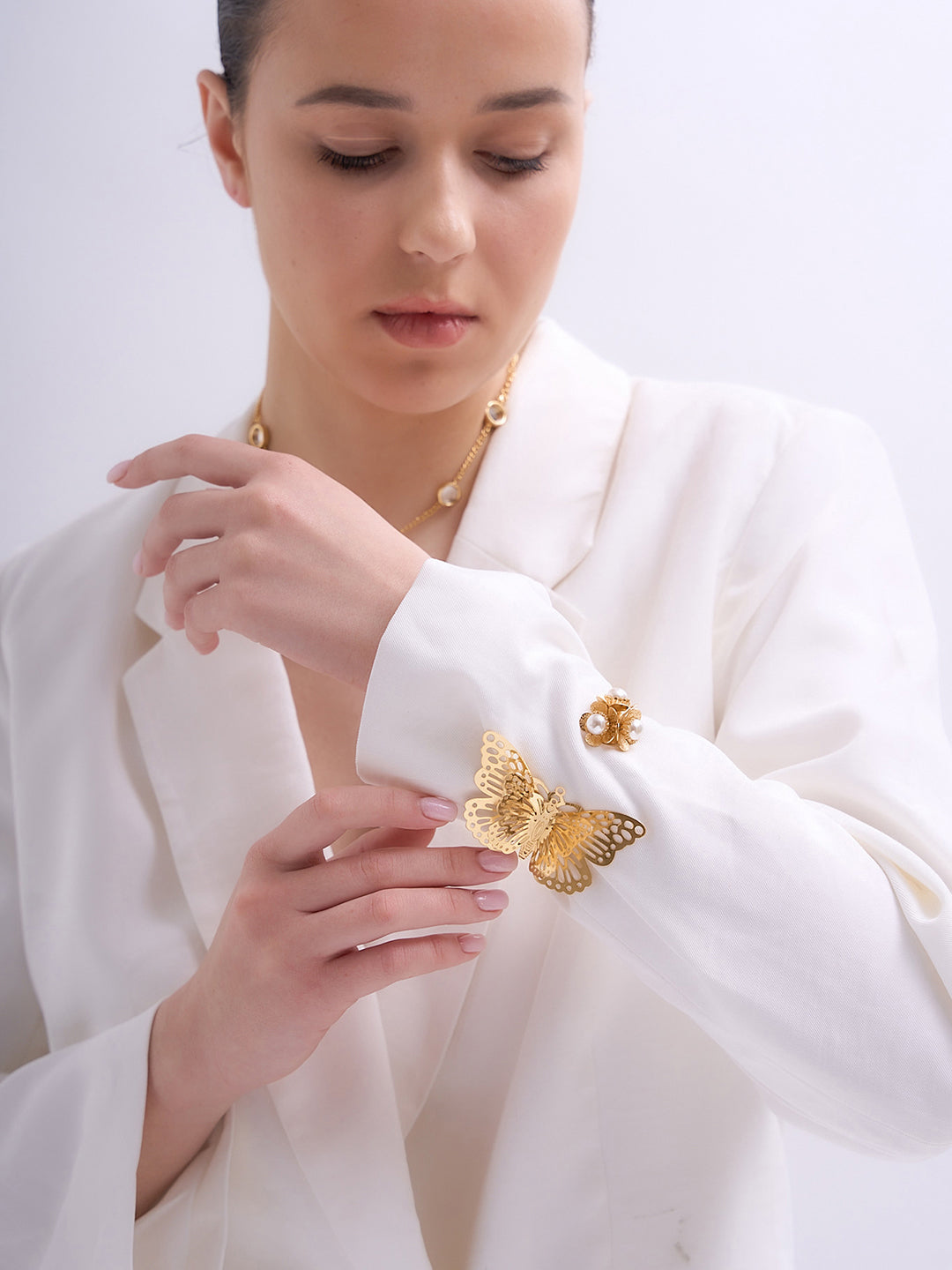 Classy, Effervescent and Gorgeous as ever, the Chica handcuff is one to be in awe of. Highlighting an intricately designed butterfly motif that reflects light beautifully, the handcuff is completed with pearl florets to accentuate its detailing. Rock this handcuff with an indian outfit or just power fits to feel the main-character energy!