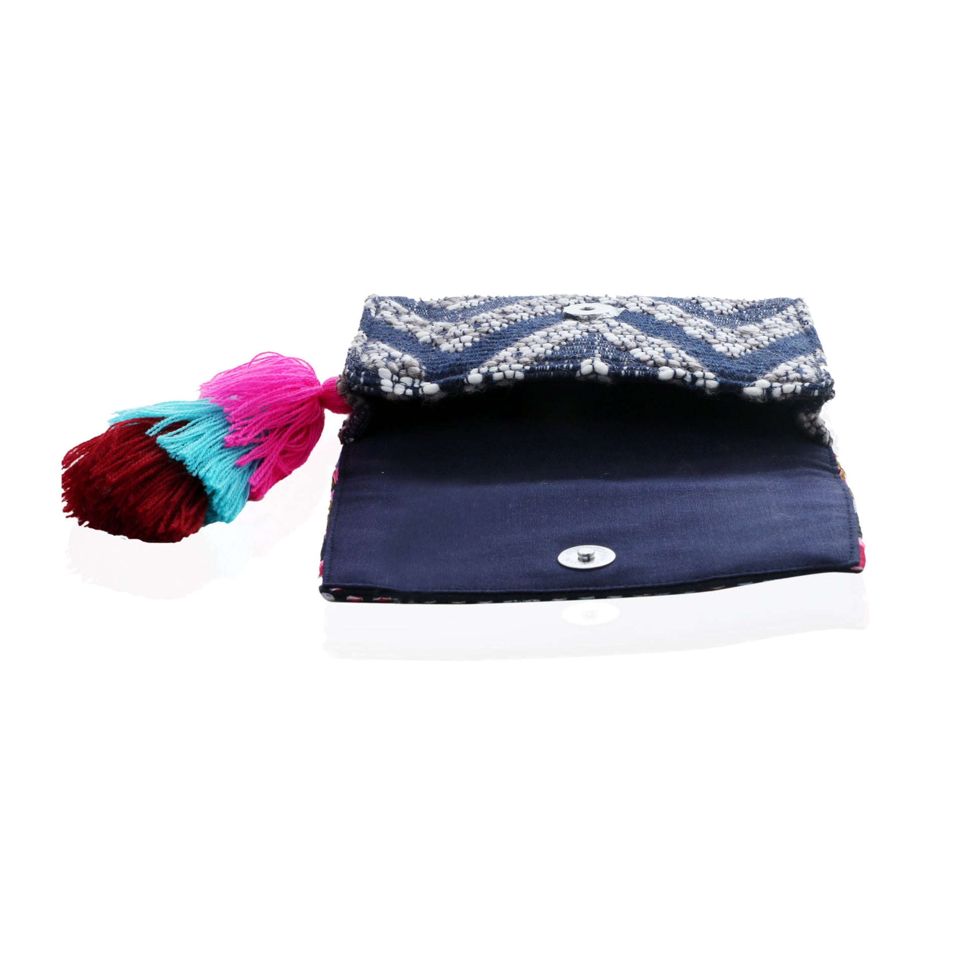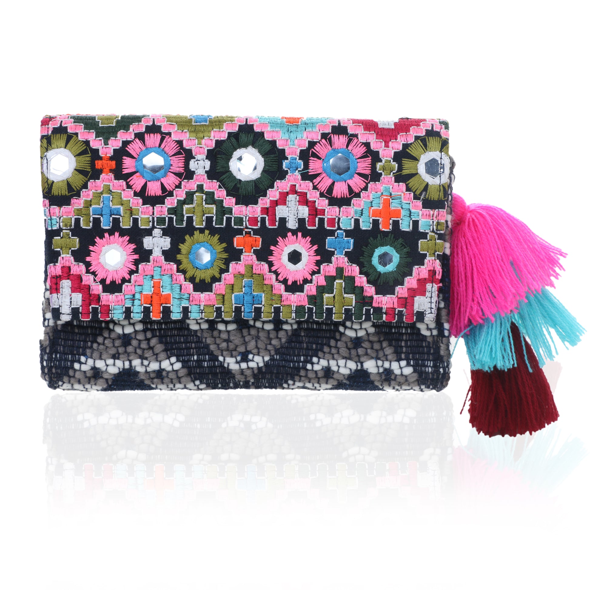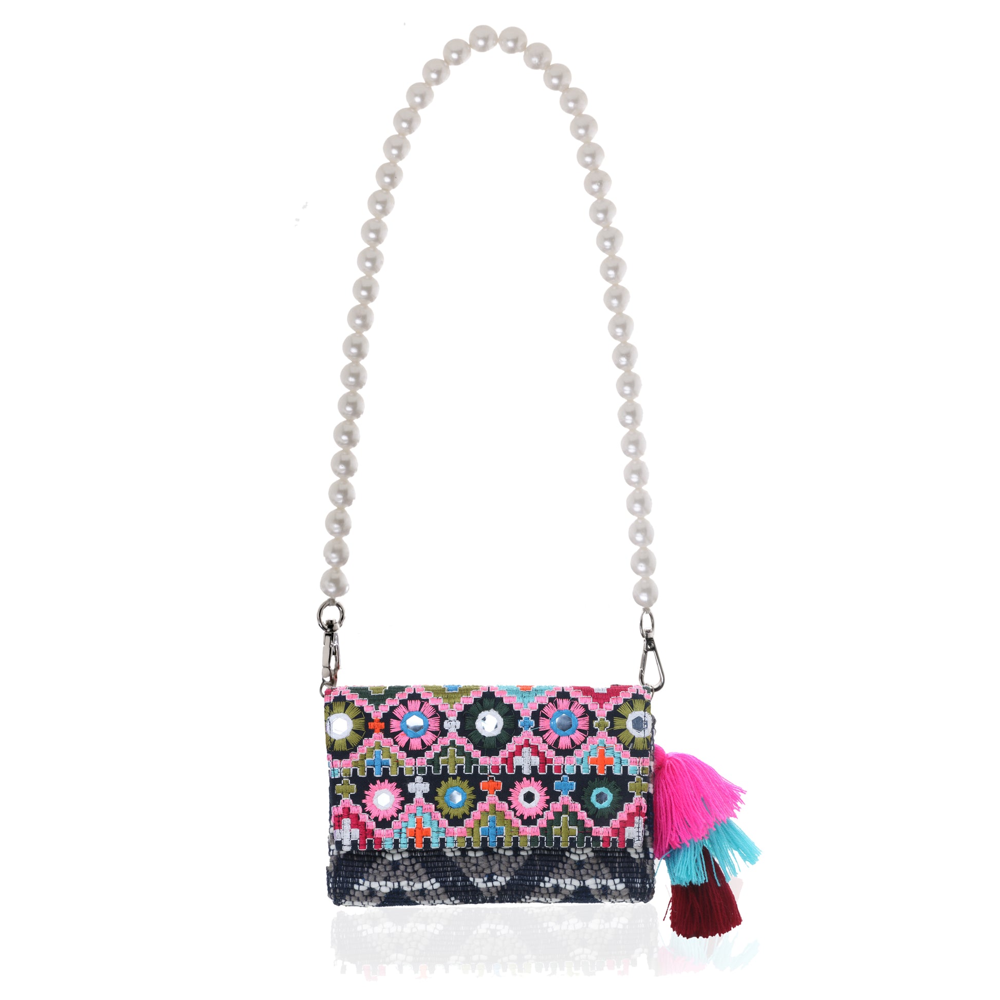 This hand embroidered belt bag is perfect to accentuate any regular outfit. Its vibrant, fun and playful. It also comes with a gorgeous pearl string that can be attached to the bag with ease. A perfect accessory for whenever you want to step out.