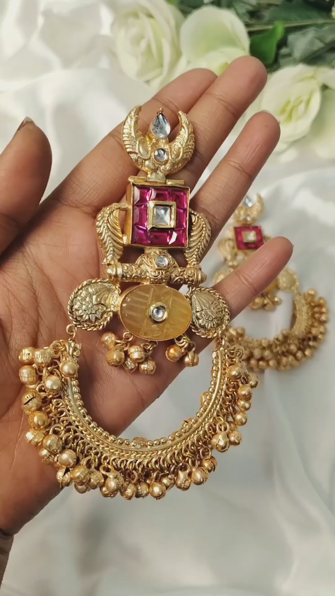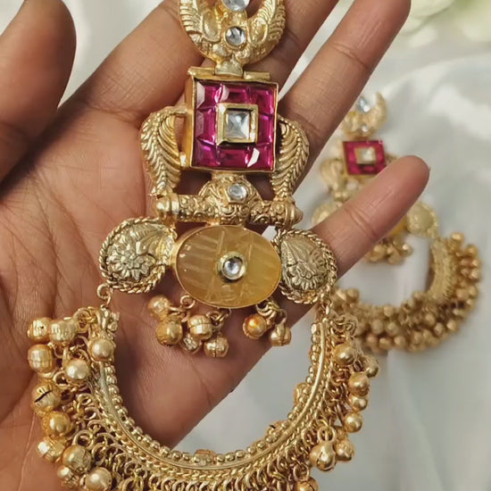 Darbar Earrings feature an ornate crest highlighted with clear stone accents, leading into a striking pink square enamel frame that adds bold contrast. The smooth yellow oval centre enhances the design’s richness, paired with carved side motifs and small dangling beads. A wide crescent base lined with golden clusters completes the look—grand, vibrant, and perfect for festive statement styling.