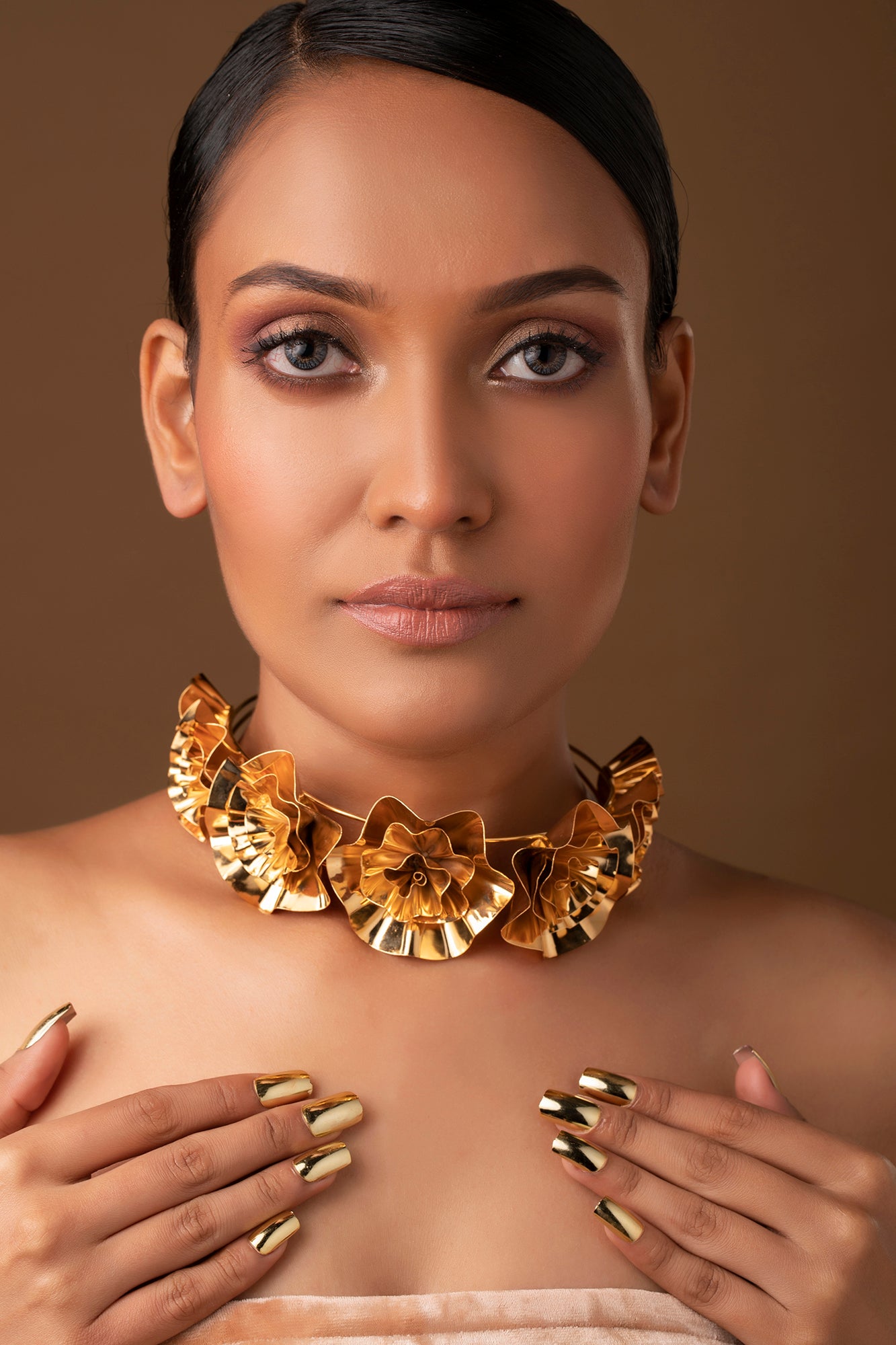 Effortless grace adorned onto subtly screaming chrome, the Darla Choker is crafted for the woman who is delicate as a flower & yet powerful!Signifying the varied roles perfected by a woman, the layers of each floret add an edge to the magnificence of this stunning Choker!