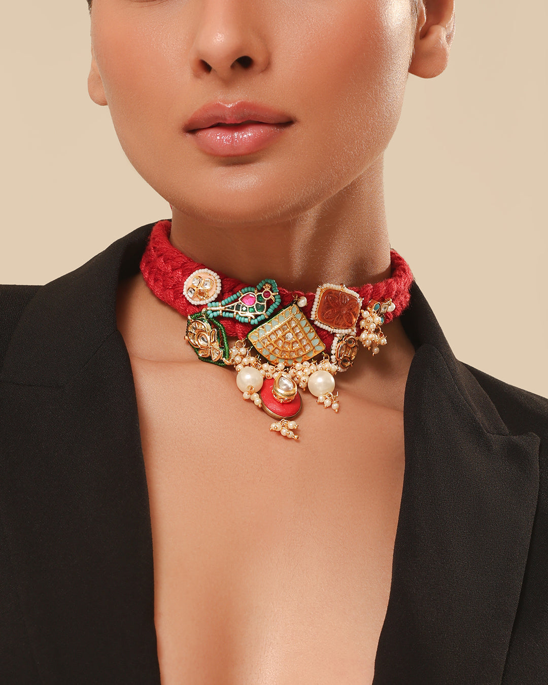 Each neck piece in this collection is a dialogue between heritage and modernity. Designed with traditional artistry, they feature exquisite pachi, kundan, and polki work, adorned with various semi-precious stones. Every detail is gold-plated, radiating opulence while remaining versatile. Whether paired with a saree, lehenga, or Indo-western attire, these neck pieces are crafted to turn heads and anchor your look in timeless elegance.