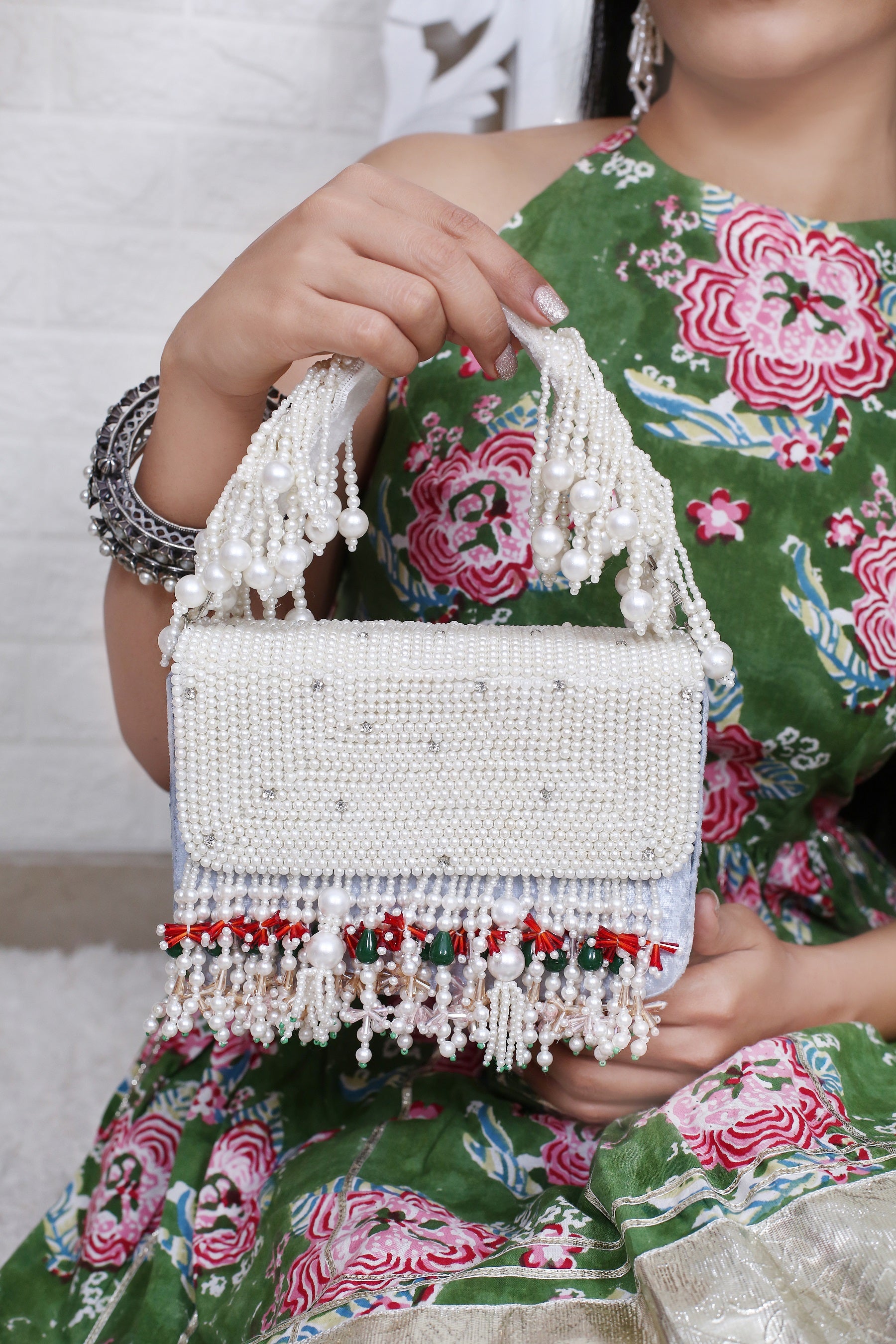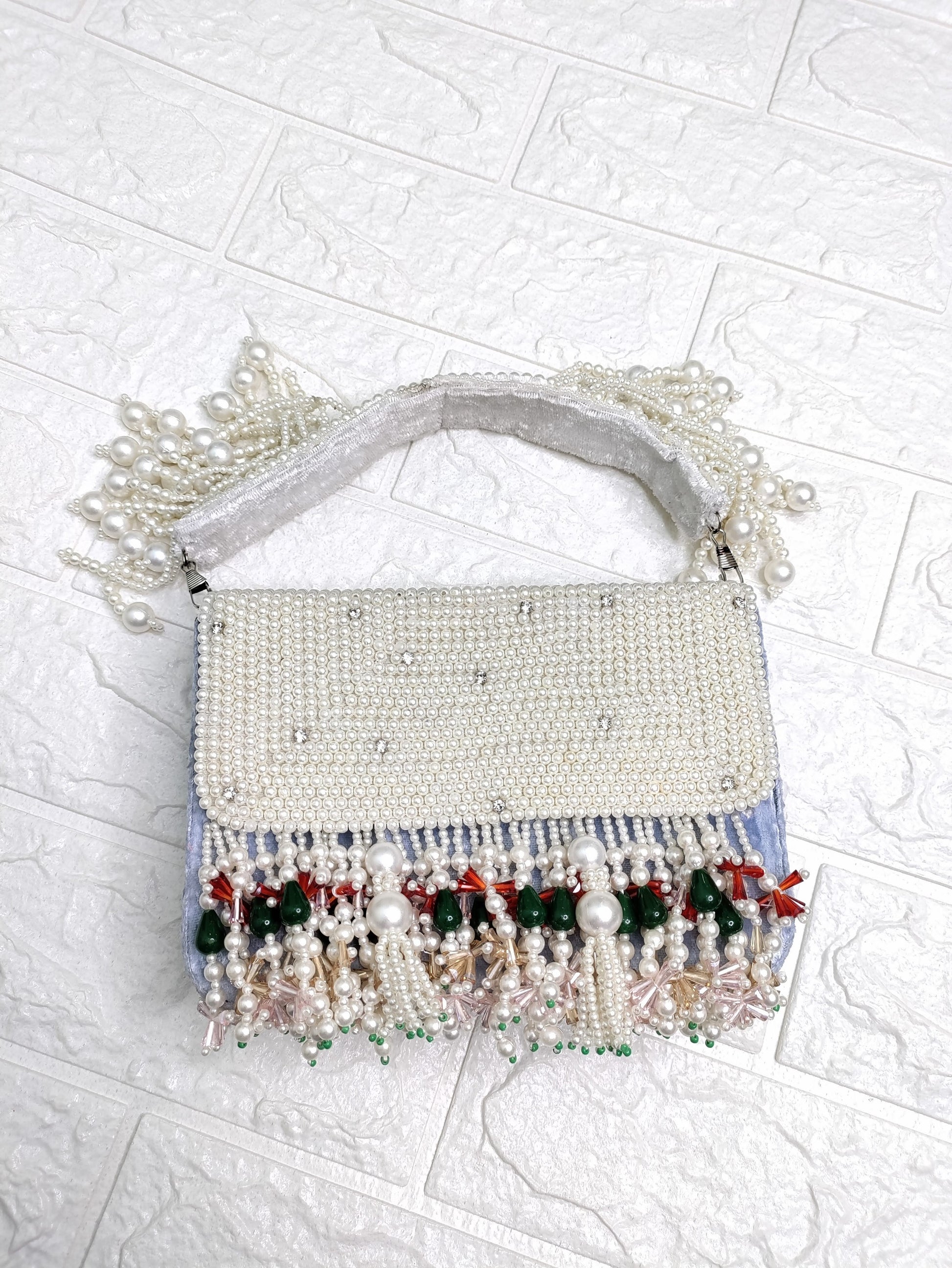 Elan Velvet Pearl Potli bag handcrafted and embellished with pearls, pearls and more pearls and finished off with multi colored beaded latkans.