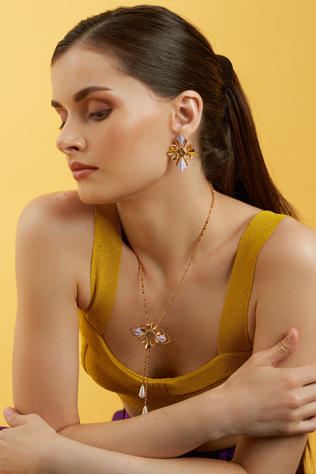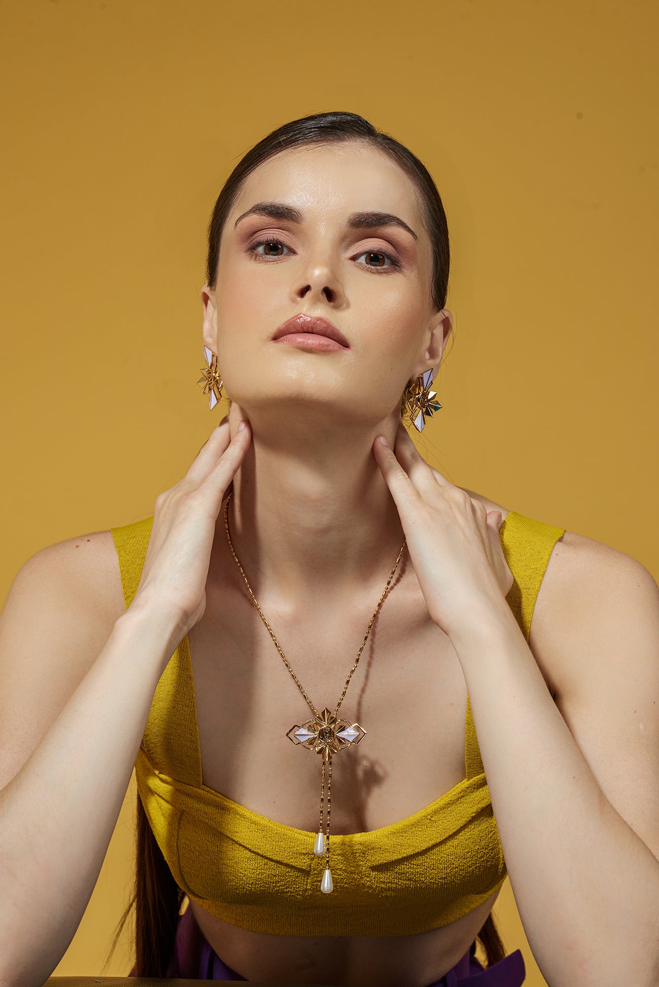 Adorned with enamelling of popping hues onto subtle gold chrome, the Elysian pendant is an exquisite choice. Significant of fine design, this pendant reflects regal opulence in a harmonious way. Embellished with drooping pearls, the Elysian pendant has an auric charisma to effortlessly elevate your ensemble.