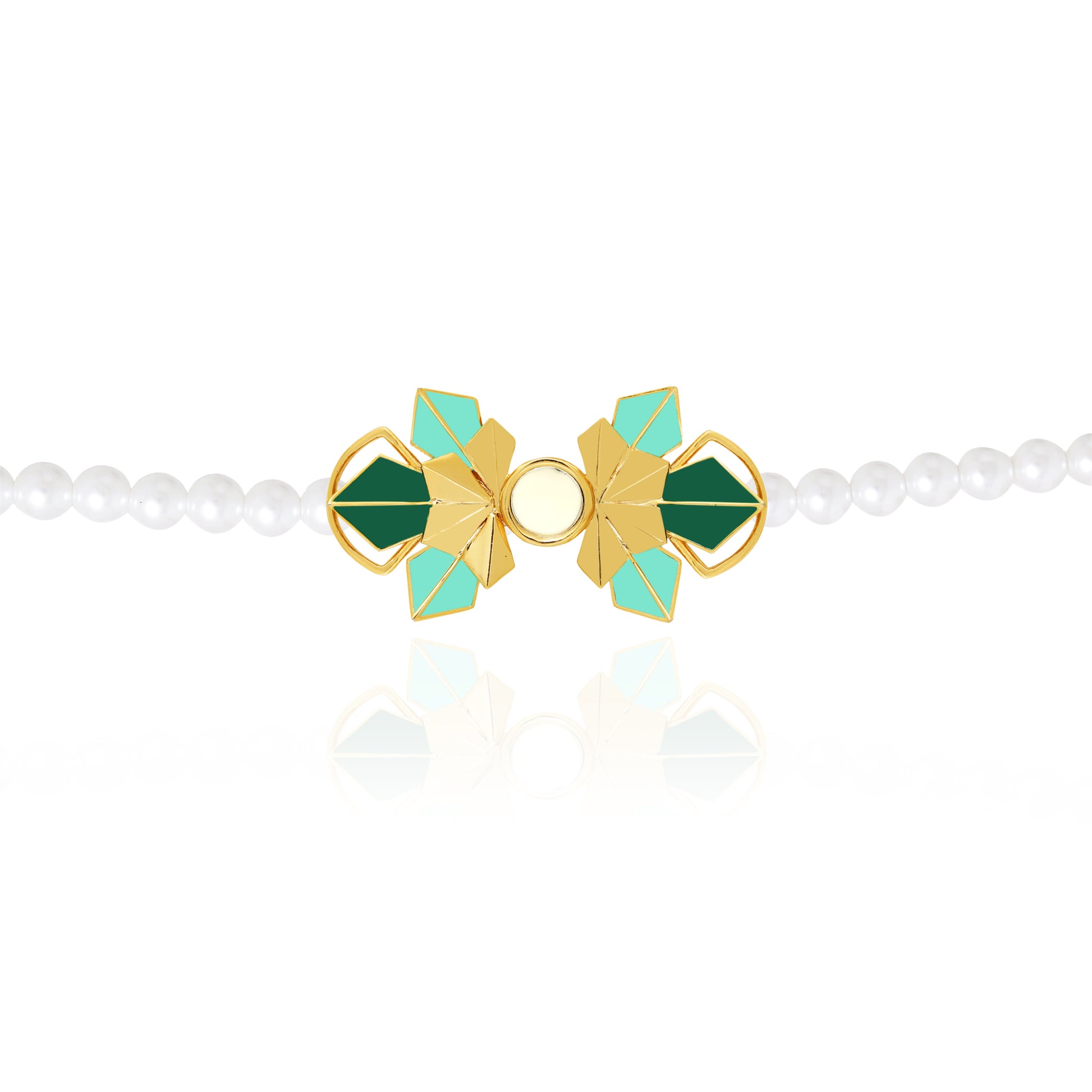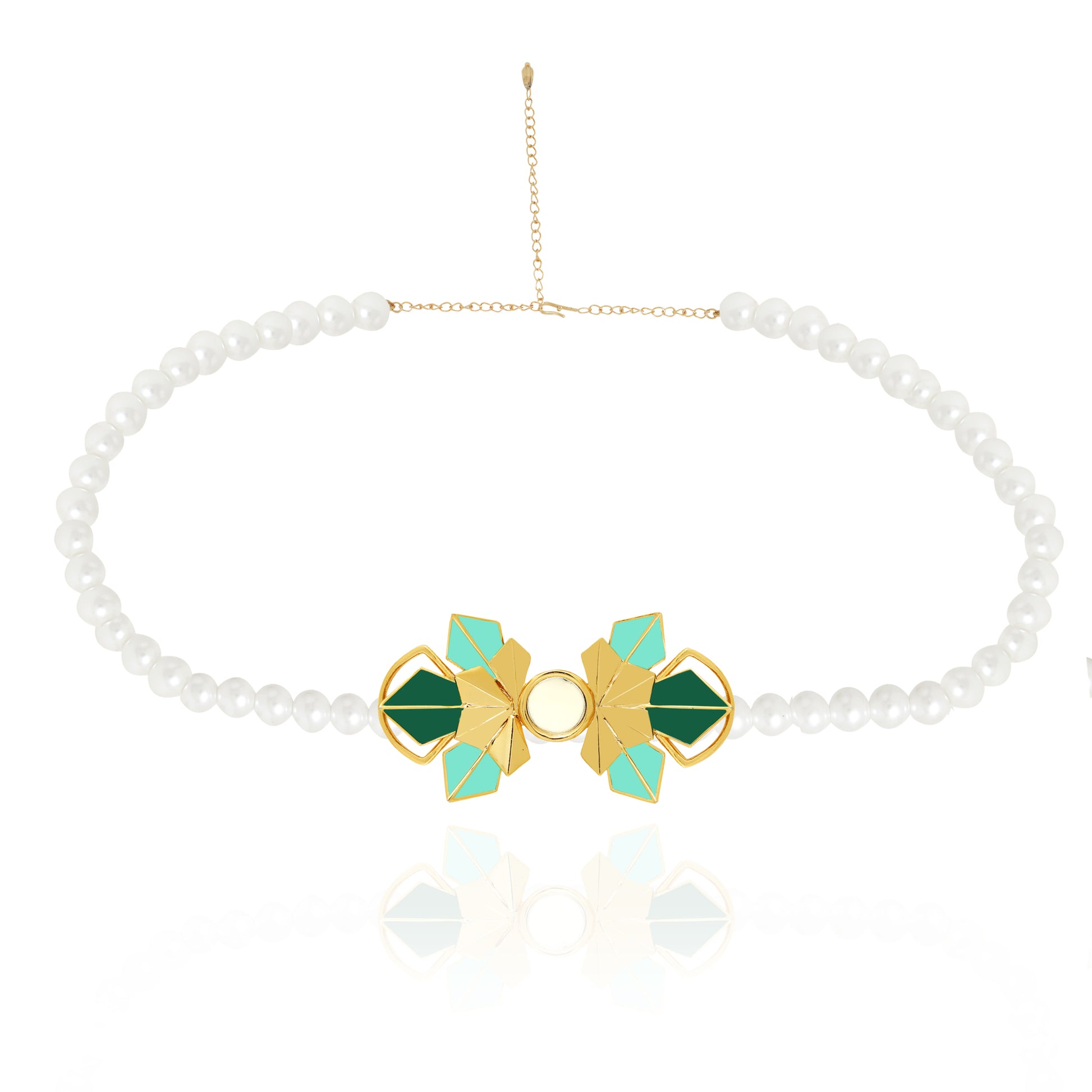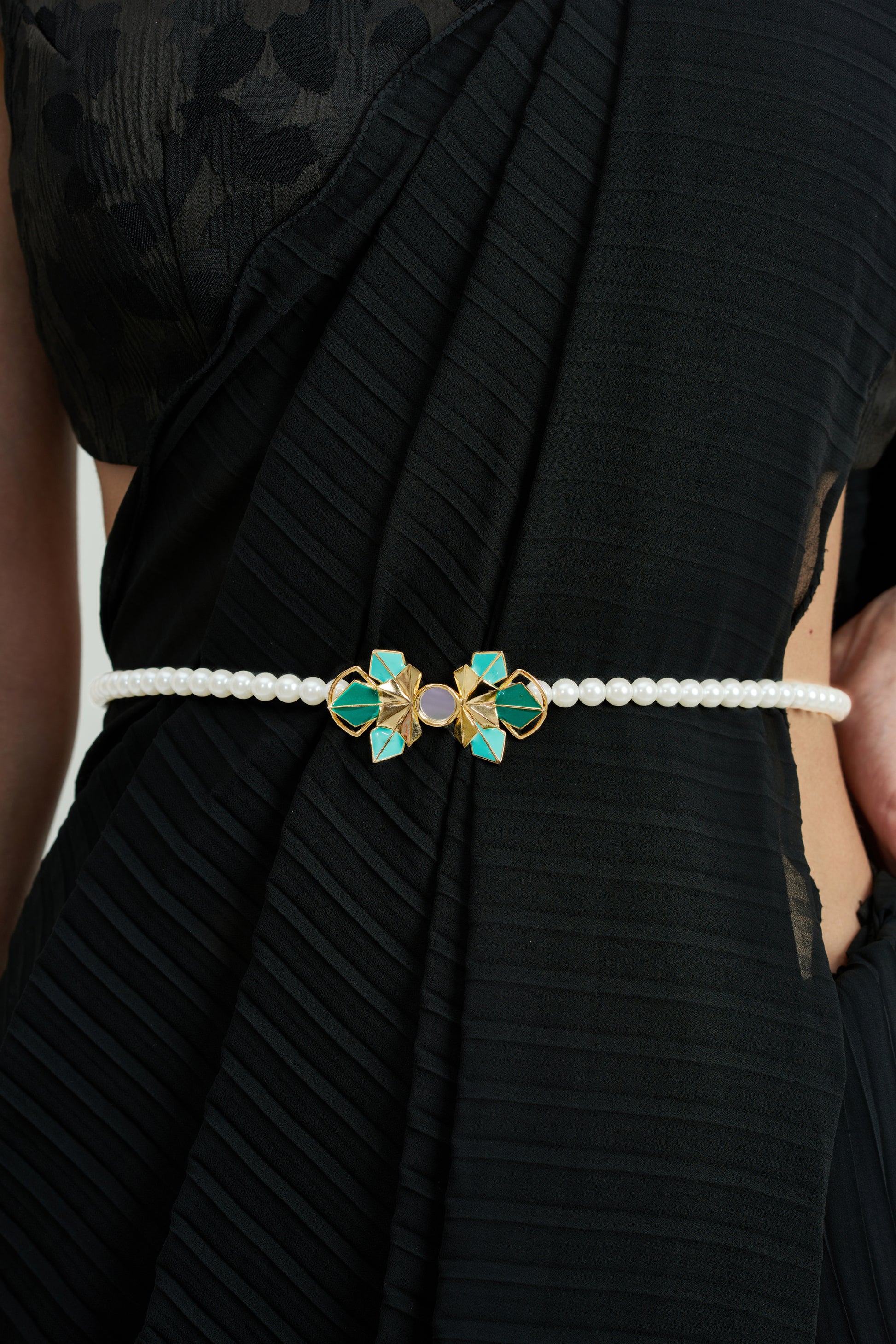 An epitome of graciously crafted design, the Enchantress Belt is significant of the highest in the room. With a fine attention to details, this belt can amp up your accessory vanity. Dress your waist with beautiful pearls amalgamated with shades of royal green to feel and look your best.