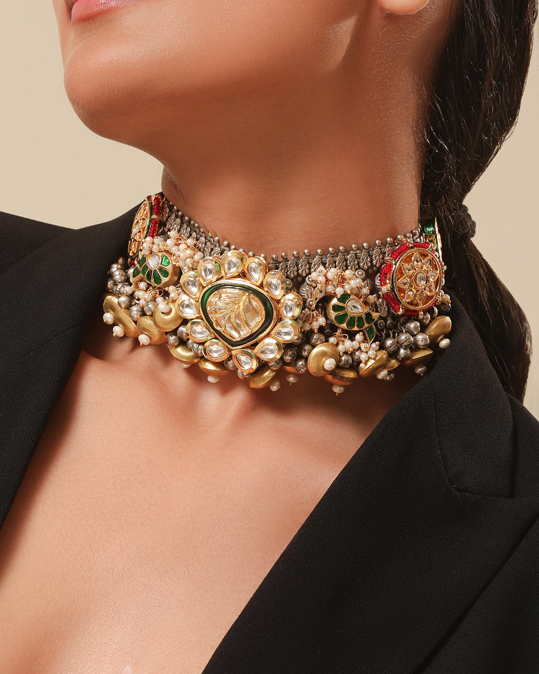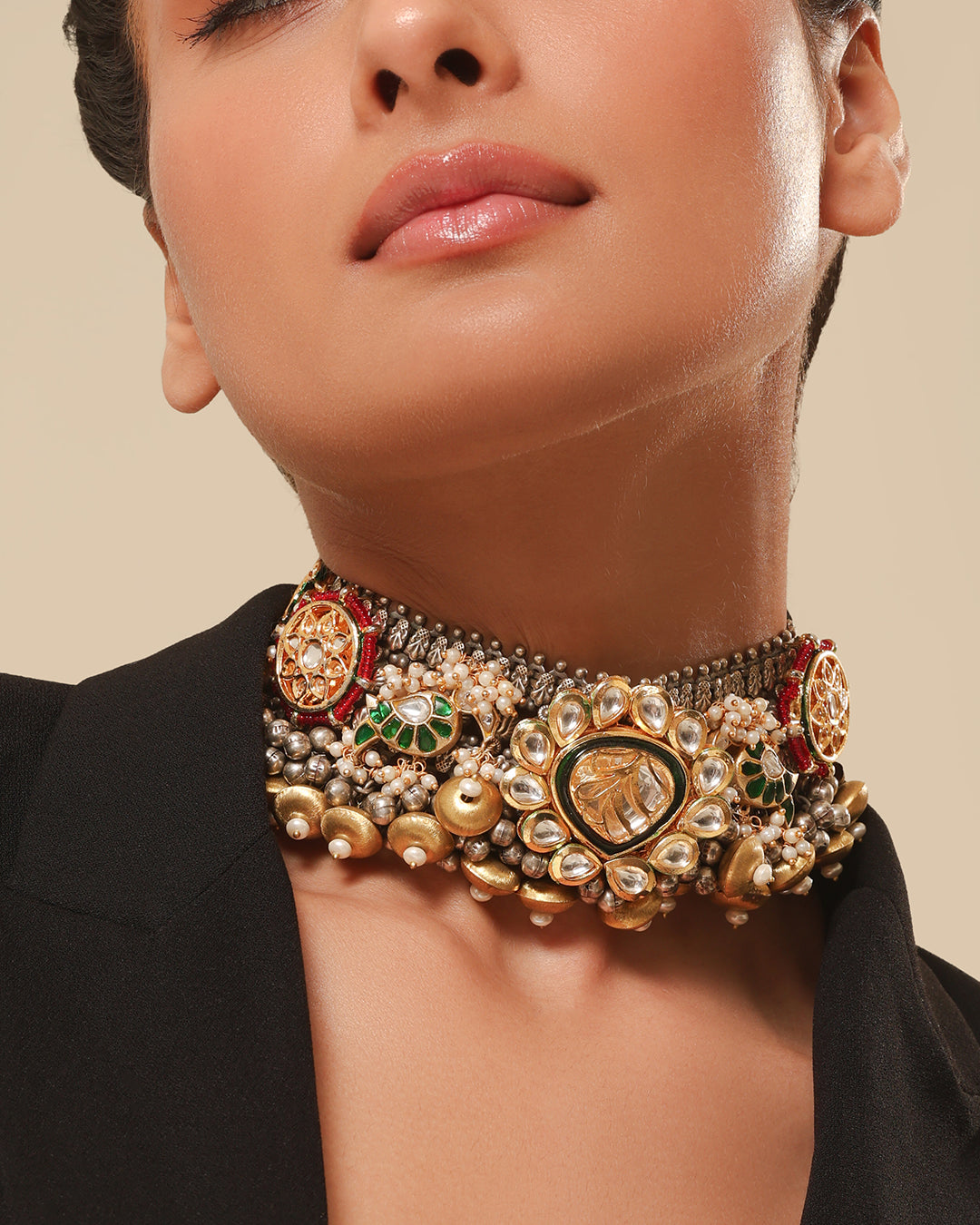 Each neck piece in this collection is a dialogue between heritage and modernity. Designed with traditional artistry, they feature exquisite pachi, kundan, and polki work, adorned with various semi-precious stones. Every detail is gold-plated, radiating opulence while remaining versatile. Whether paired with a saree, lehenga, or Indo-western attire, these neck pieces are crafted to turn heads and anchor your look in timeless elegance.