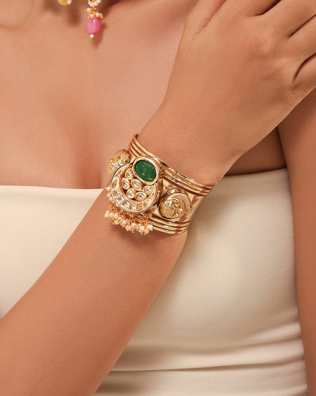 Crafted with inspiration drawn from India’s cultural tapestry, these gold-plated bracelets embody grace and strength. Their versatile designs make them equally striking with a saree, a lehenga, or a contemporary fusion outfit. Bold yet refined, they are an ode to tradition reimagined for today.