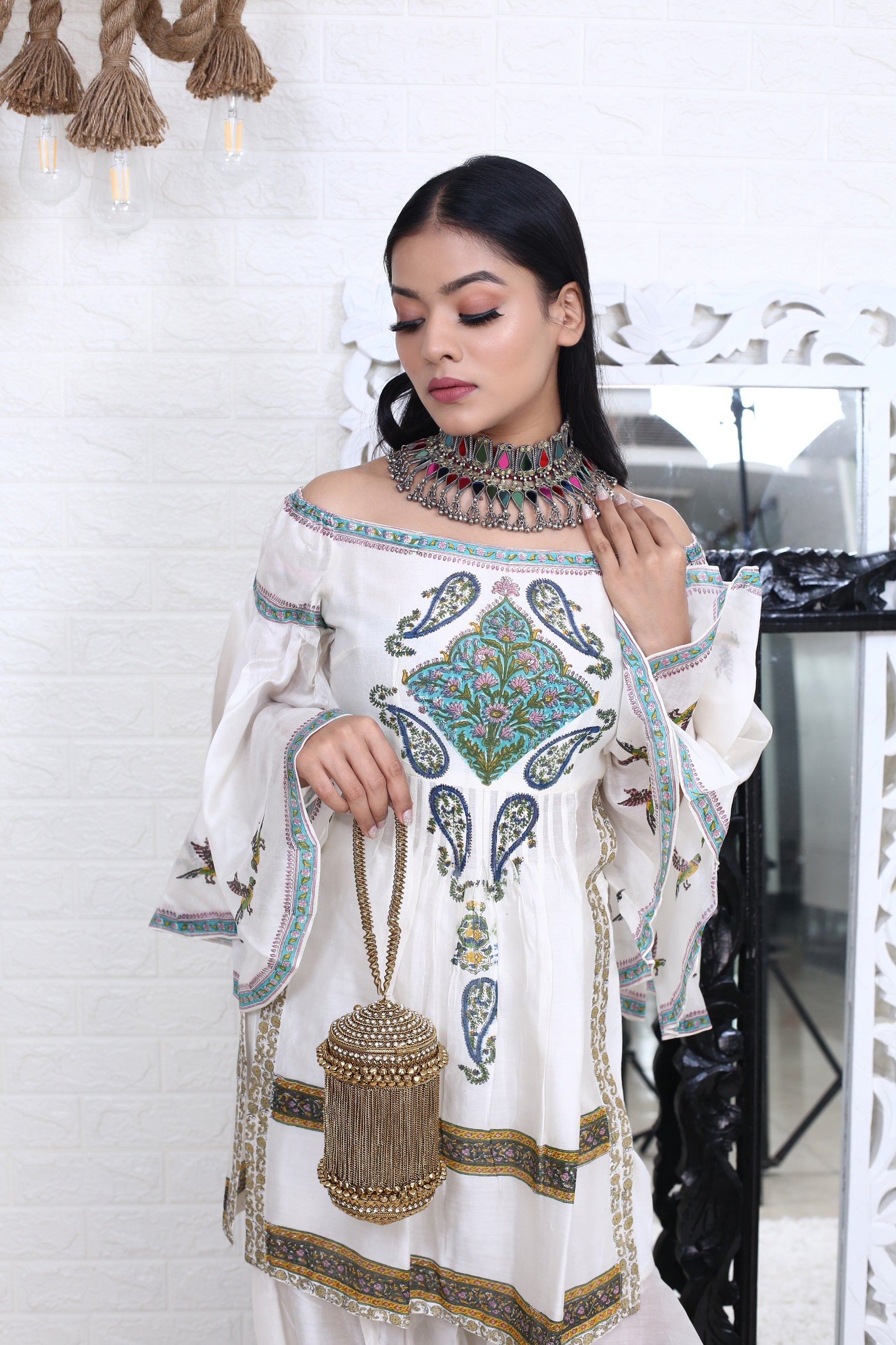 A unique golden metal clutch bag is handcrafted by the supremely talented artisans of India. This stunning brass clutch features ghungroos and stones making it a new fashion statement.
