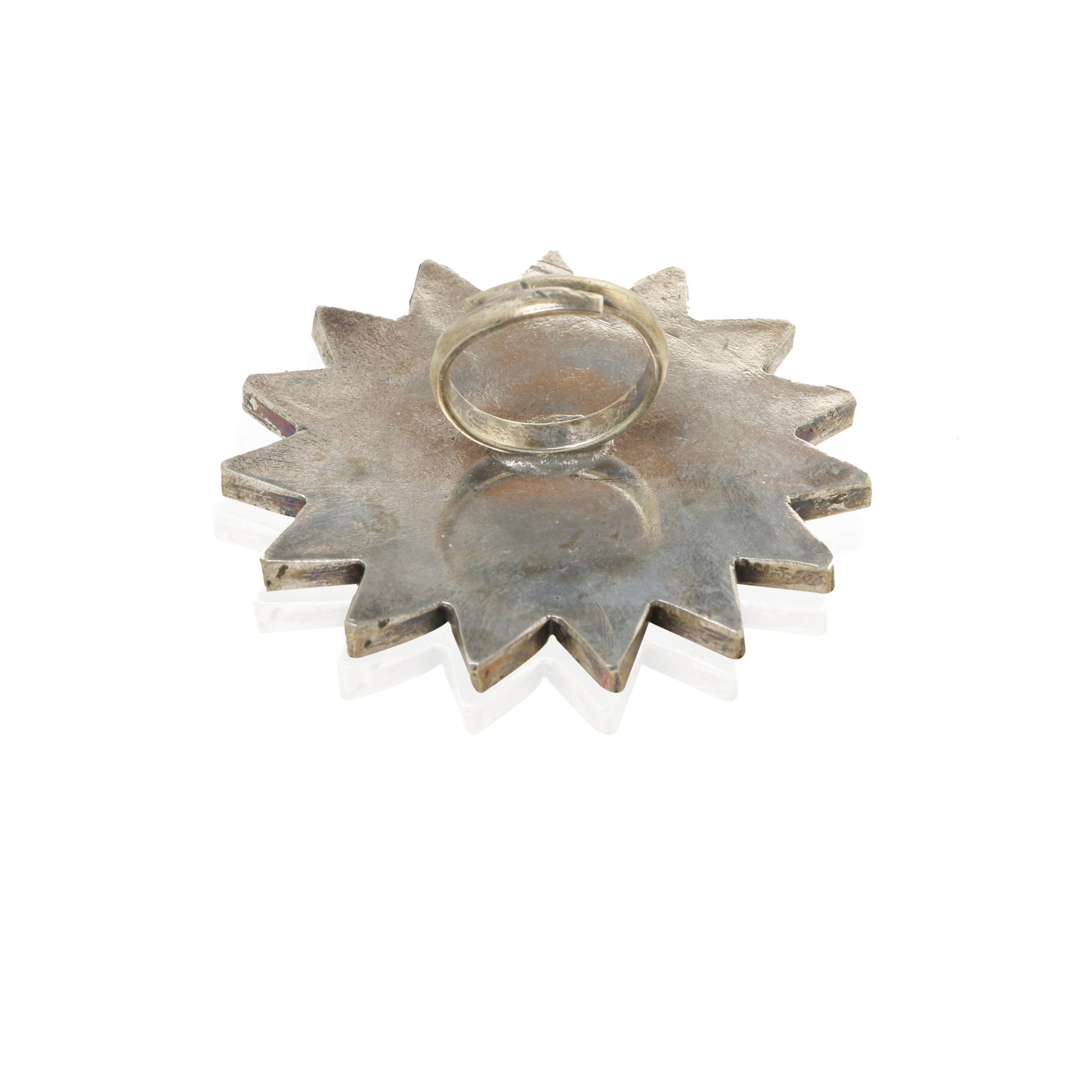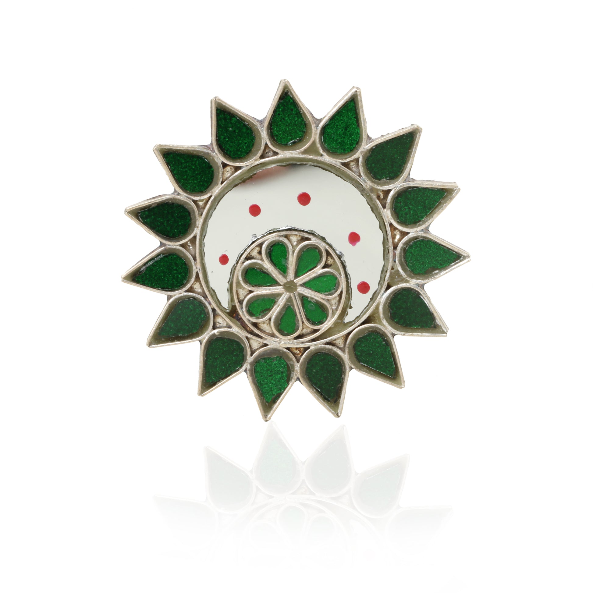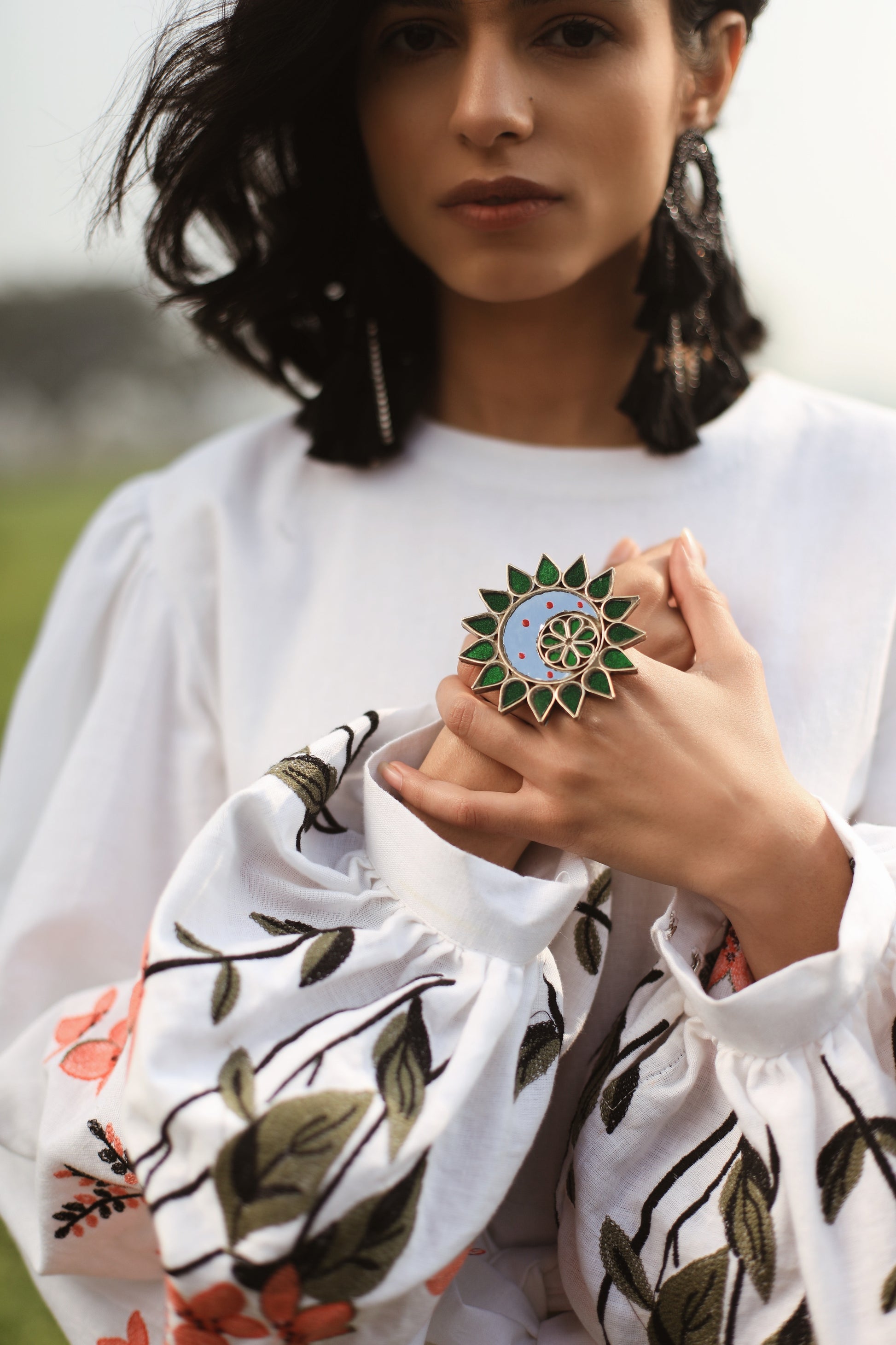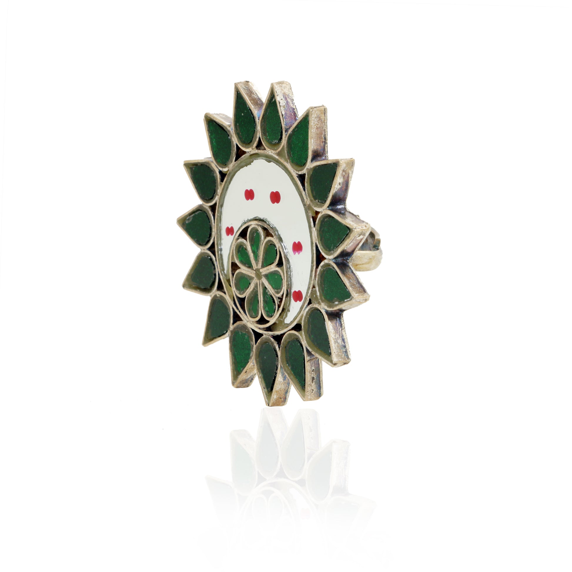 If you like to create a statement wherever you go, then this stunner of a ring is definitely for you. An ode to the skilled craftsmanship, this ring features melted meenakari work on it. The glass is individually hand cut to fit the metallic brass frame and then given a rustic finish for the final look.