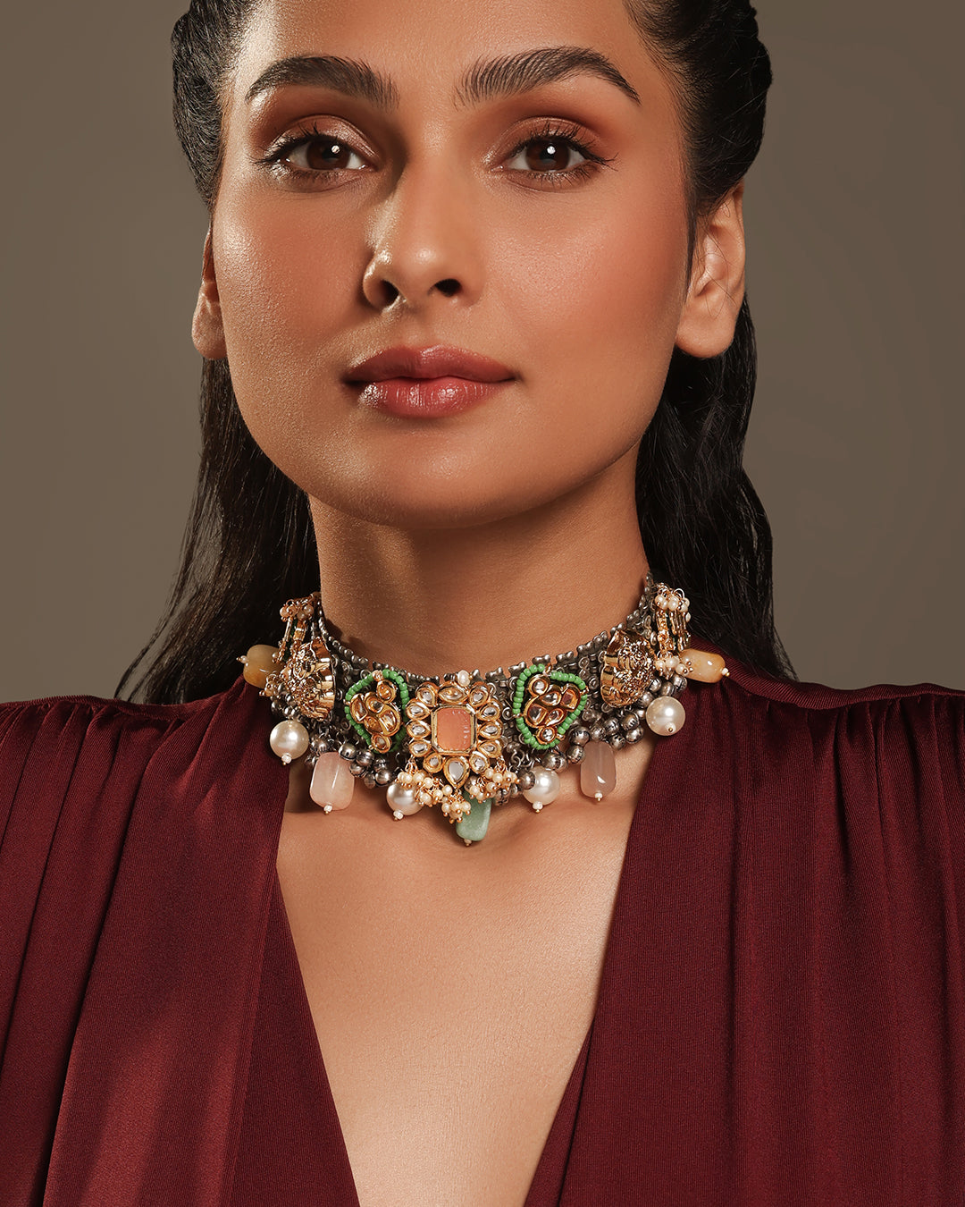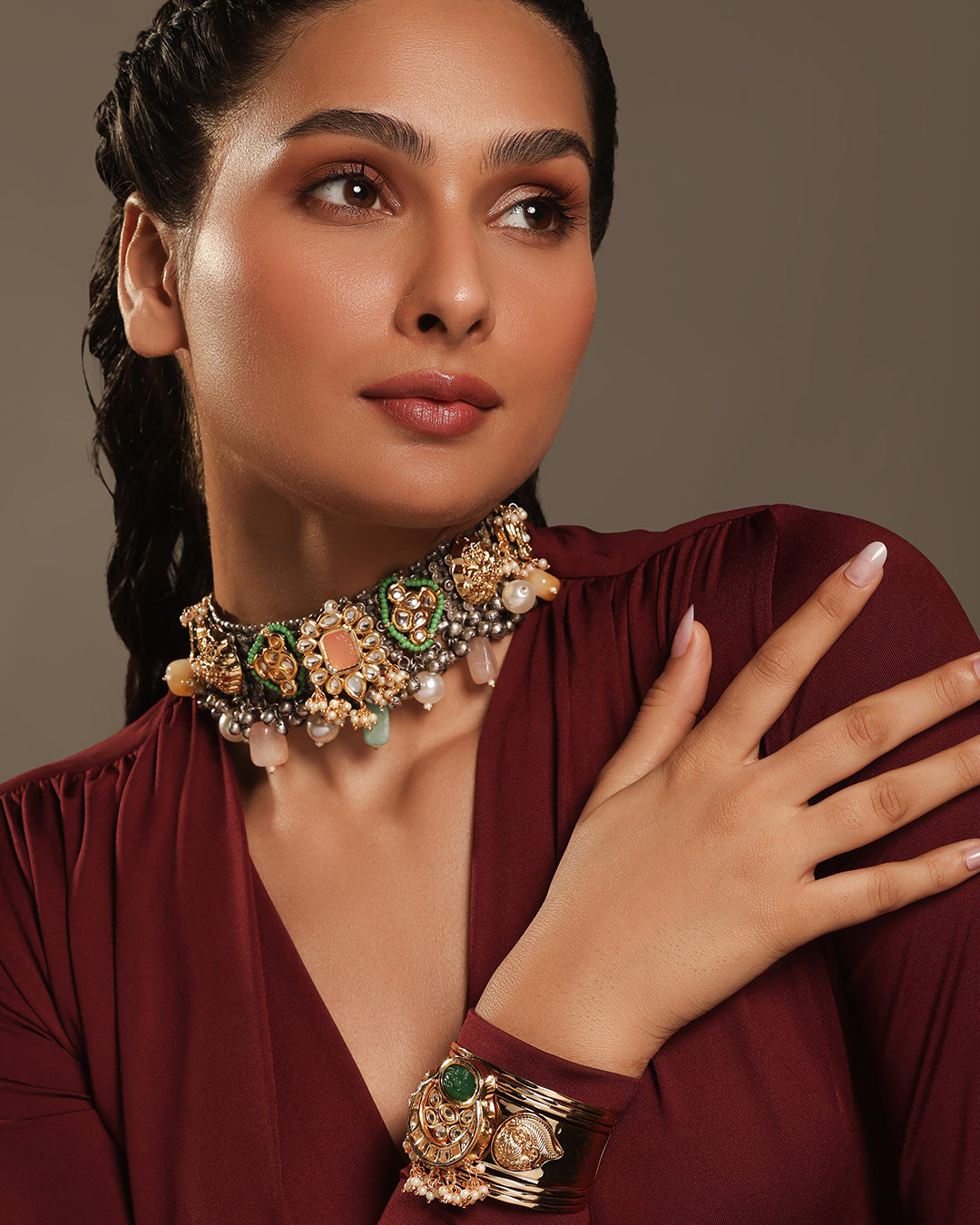 Each neck piece in this collection is a dialogue between heritage and modernity. Designed with traditional artistry, they feature exquisite pachi, kundan, and polki work, adorned with various semi-precious stones. Every detail is gold-plated, radiating opulence while remaining versatile. Whether paired with a saree, lehenga, or Indo-western attire, these neck pieces are crafted to turn heads and anchor your look in timeless elegance.