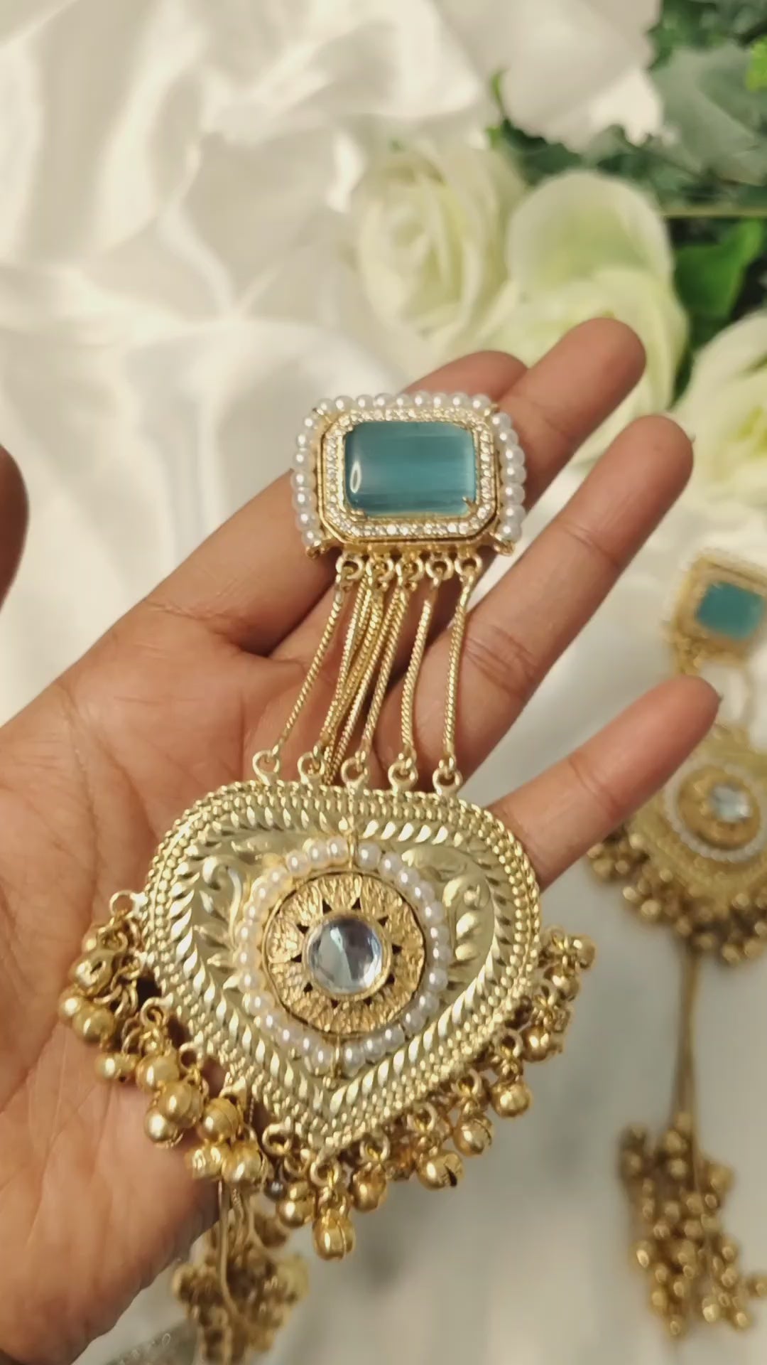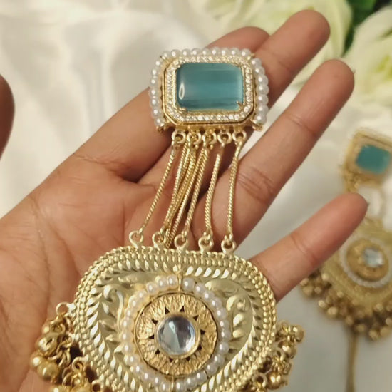 Mahal Jhumkis feature a soft pink and blue semi-precious stone stud bordered with delicate detailing. Multiple slim chains connect to an ornate heart-shaped centre highlighted with mirror-cut stones and intricate filigree work. The base is finished with a cluster of beads and long tassels, creating graceful movement. A refined, elegant design perfect for festive and contemporary traditional looks.