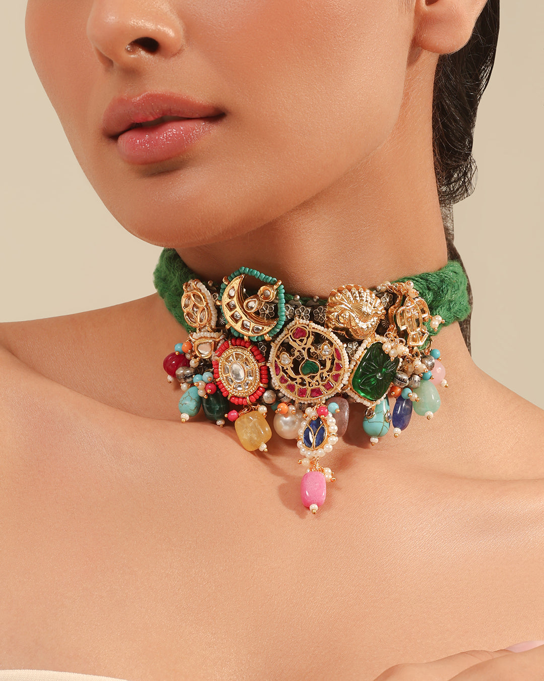 Each neck piece in this collection is a dialogue between heritage and modernity. Designed with traditional artistry, they feature exquisite pachi, kundan, and polki work, adorned with various semi-precious stones. Every detail is gold-plated, radiating opulence while remaining versatile. Whether paired with a saree, lehenga, or Indo-western attire, these neck pieces are crafted to turn heads and anchor your look in timeless elegance.