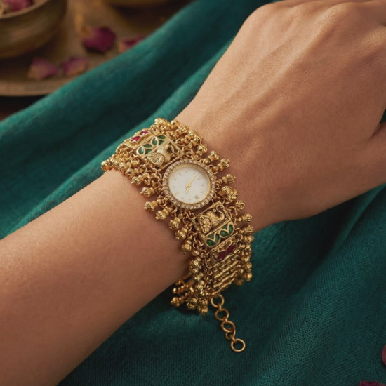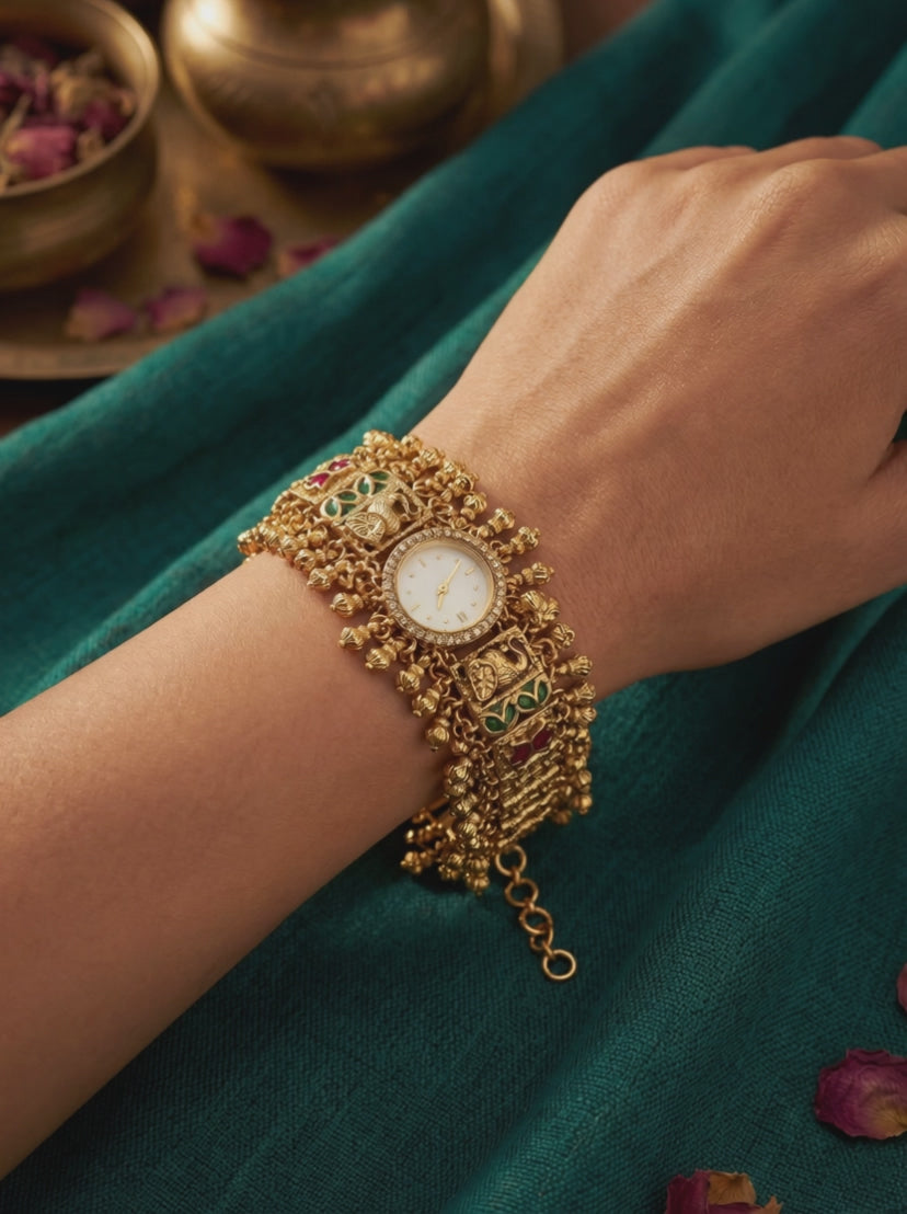 Royal Heritage Watch crafted with traditional ghughroo detailing and intricate ethnic design, giving a rich and elegant look. Perfect for weddings and festive wear, this statement timepiece beautifully blends classic tradition with modern style. A must-have royal accessory for special occasions.