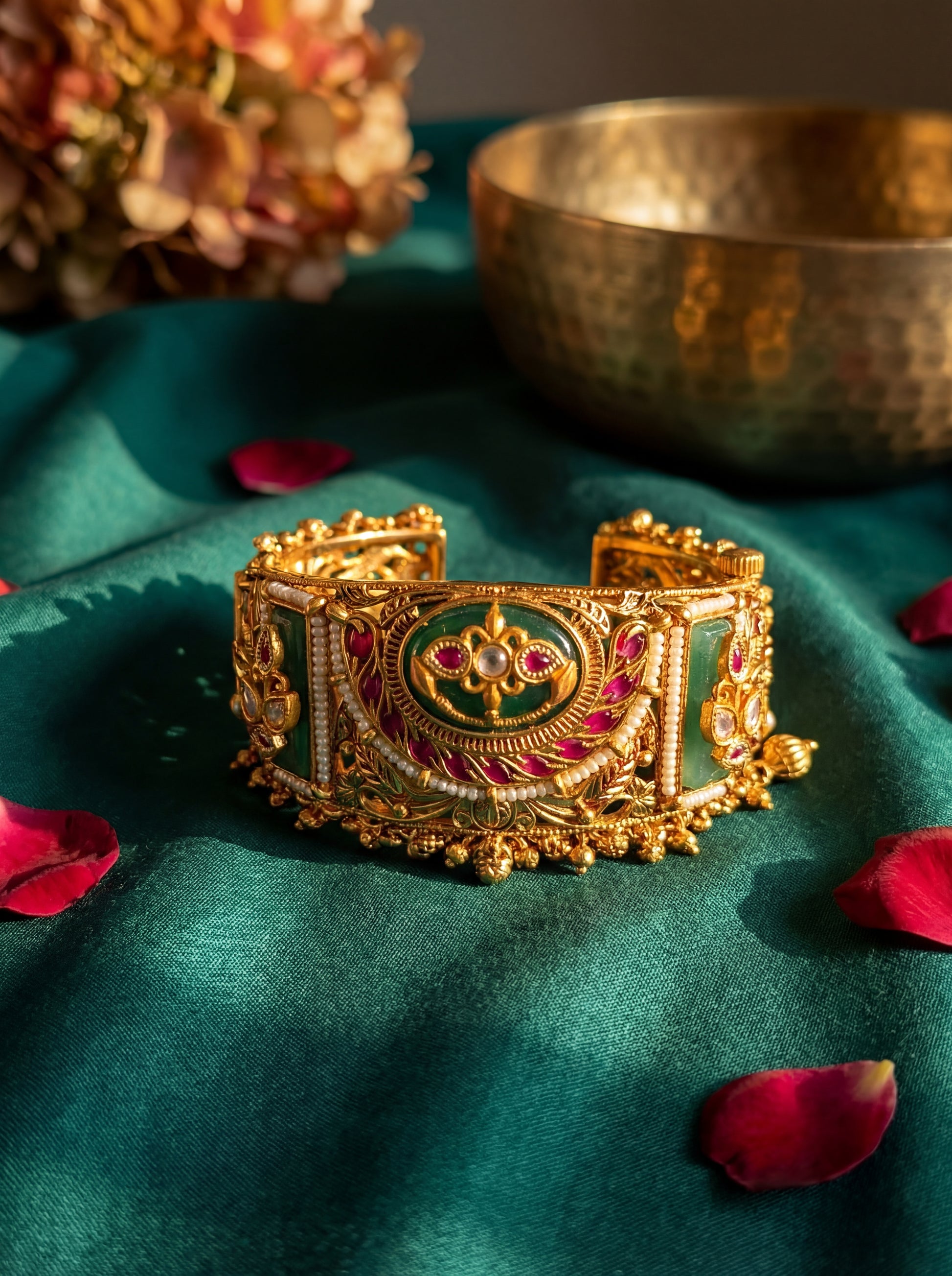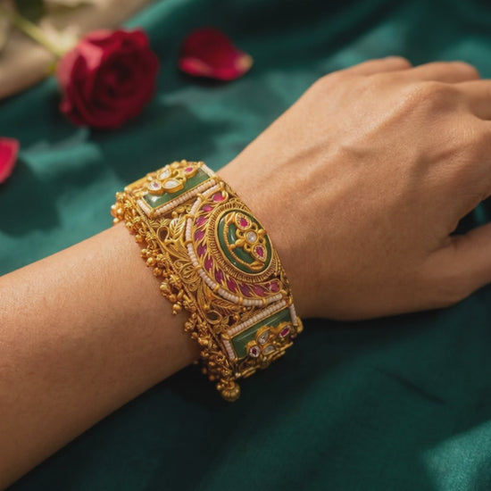 A majestic heritage bracelet crafted in intricate gold detailing, adorned with rich emerald and ruby accents, delicate pearls, and graceful ghughroo charms. Every motif reflects timeless artistry and royal grandeur. Perfect for weddings and festive celebrations, this statement piece adds regal elegance and luxurious brilliance to your traditional ensemble