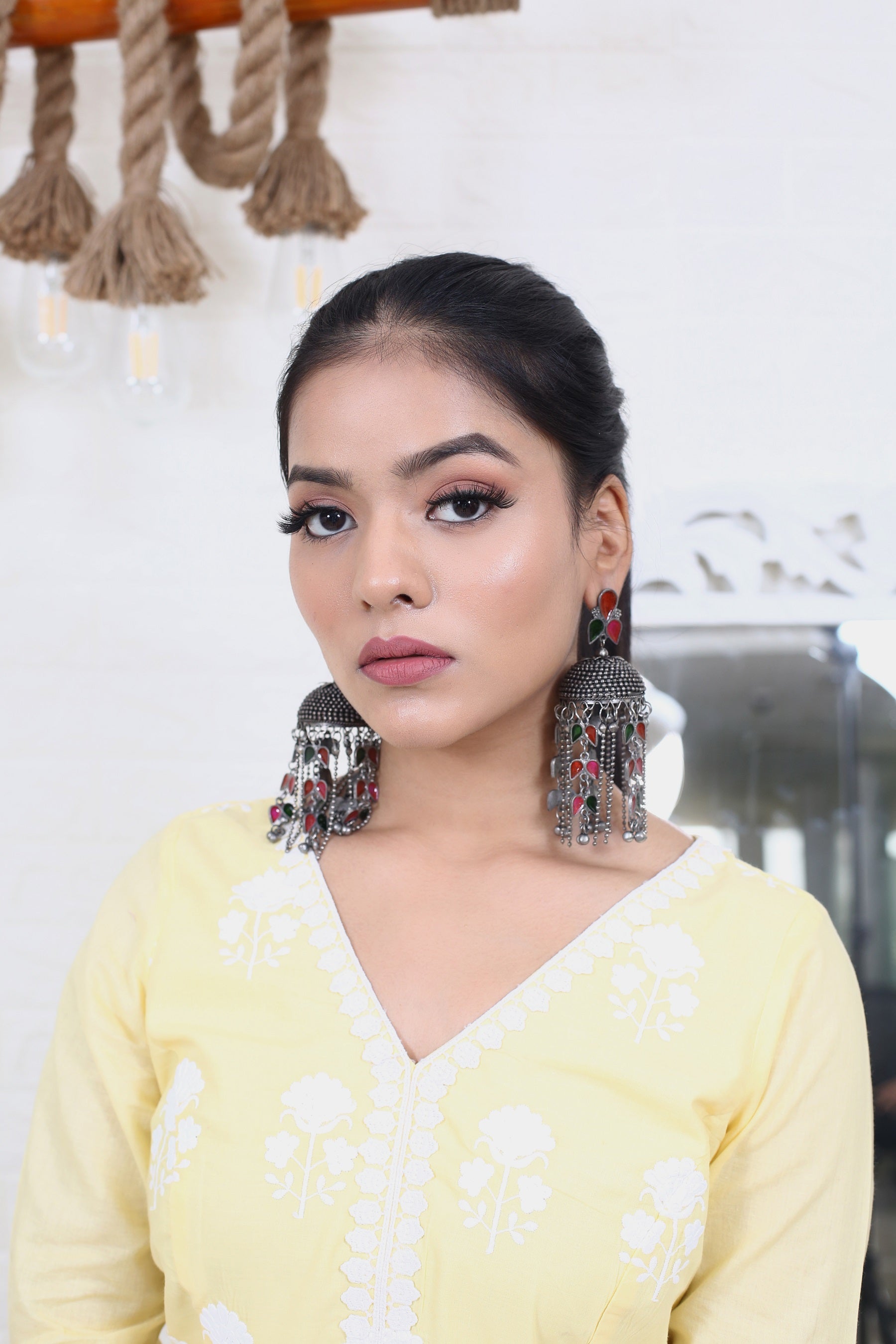 Knnotcase’s this original nazeen Afghan jhumkas are nothing but the flawless and right amount of chic. Oxidized jewelry never fails to amaze you, nazeen goes with any Indian attire. Handcrafted in banjara culture with multicolor and ghungaru that add on its gleam.