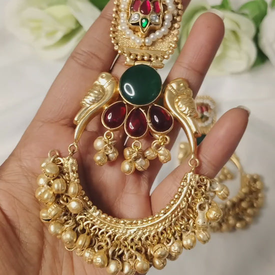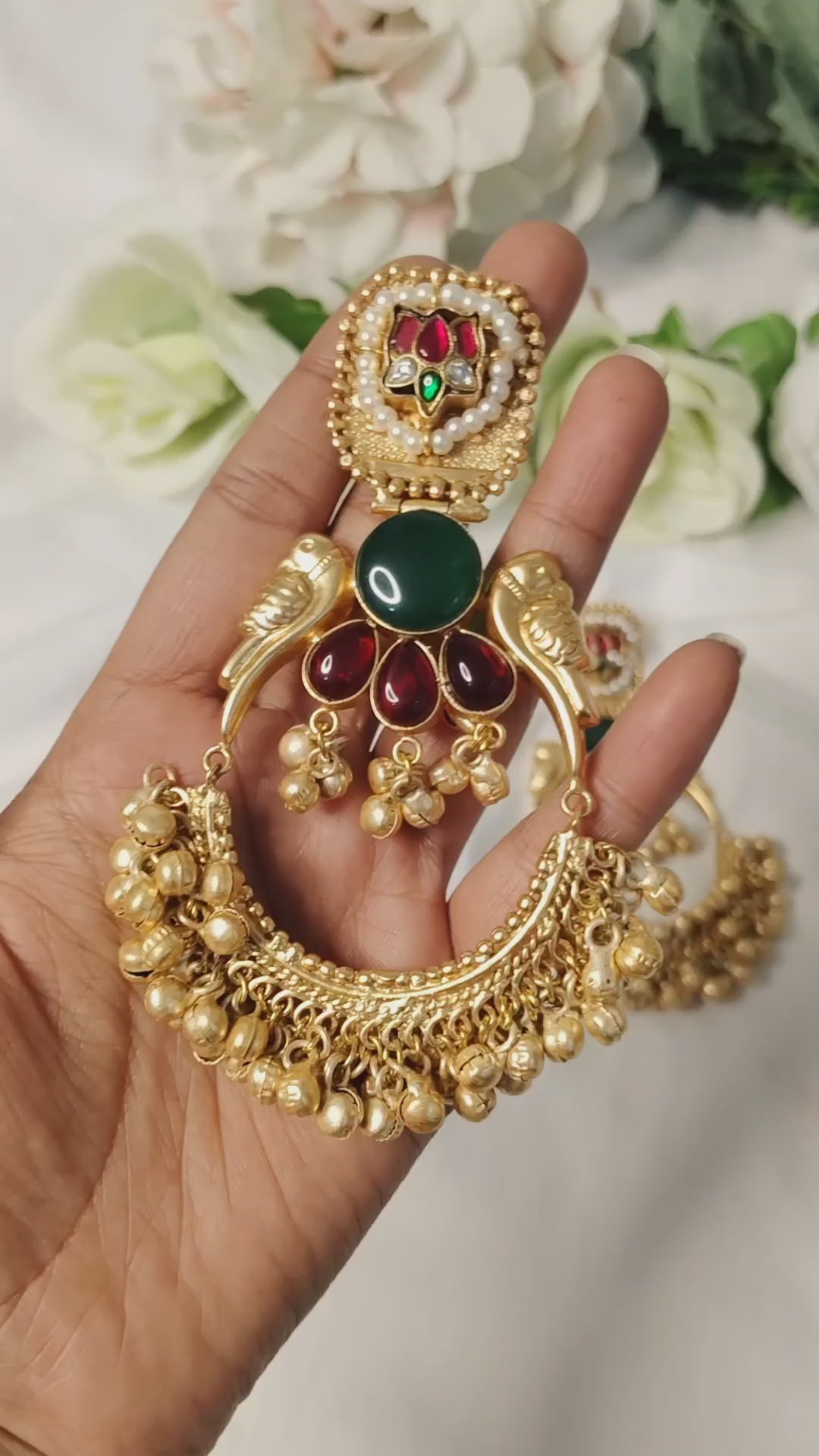 Nura Earrings feature a statement stud enriched with semi-precious stones and framed in intricate detailing. The centre showcases a bold round stone paired with teardrop semi-precious accents, creating a layered, elegant cluster. Sculpted side motifs lead into a broad crescent base adorned with pearls, beads, and textured elements. A grand, artisanal design perfect for festive and traditional styling.
