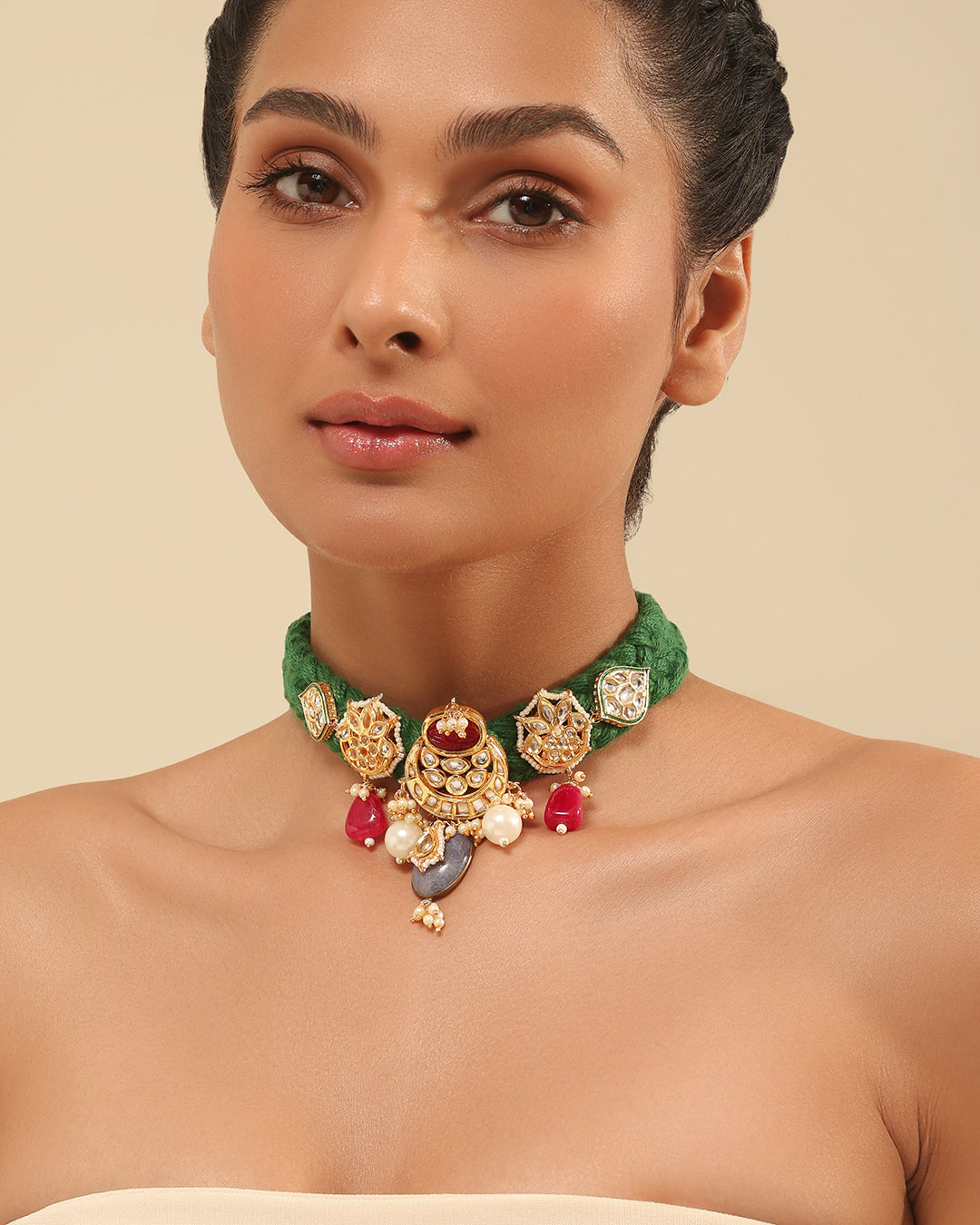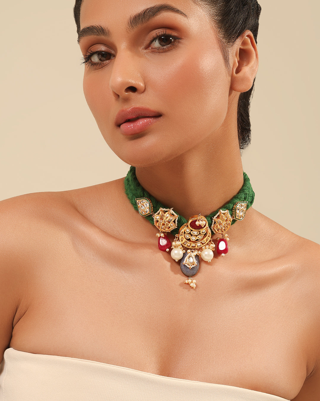 Each neck piece in this collection is a dialogue between heritage and modernity. Designed with traditional artistry, they feature exquisite pachi, kundan, and polki work, adorned with various semi-precious stones. Every detail is gold-plated, radiating opulence while remaining versatile. Whether paired with a saree, lehenga, or Indo-western attire, these neck pieces are crafted to turn heads and anchor your look in timeless elegance.