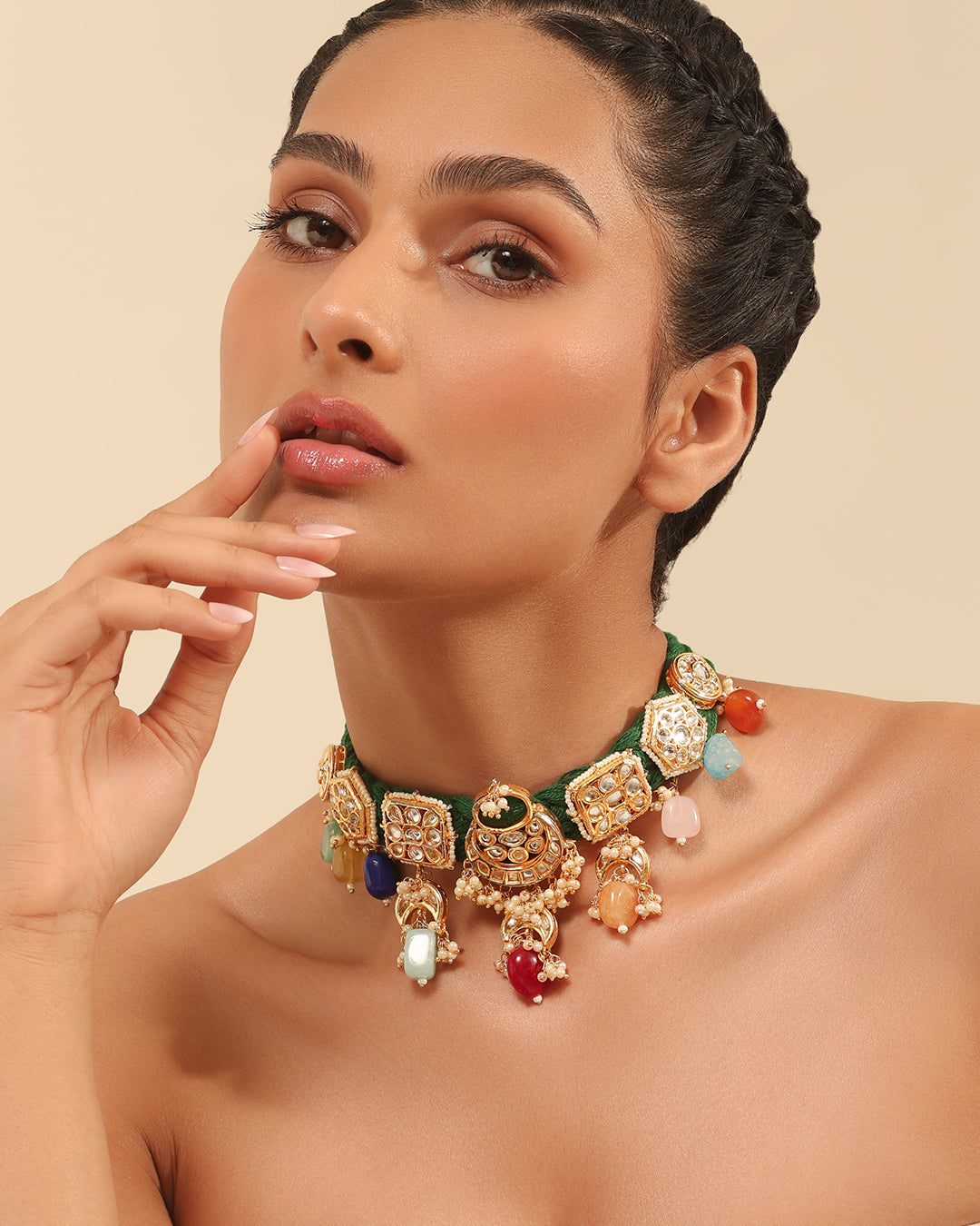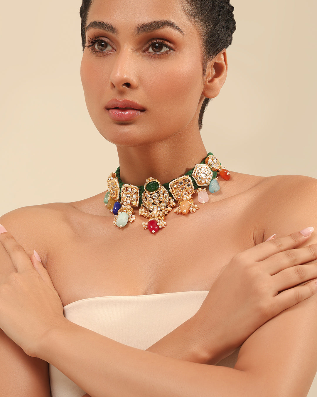 Each neck piece in this collection is a dialogue between heritage and modernity. Designed with traditional artistry, they feature exquisite pachi, kundan, and polki work, adorned with various semi-precious stones. Every detail is gold-plated, radiating opulence while remaining versatile. Whether paired with a saree, lehenga, or Indo-western attire, these neck pieces are crafted to turn heads and anchor your look in timeless elegance.