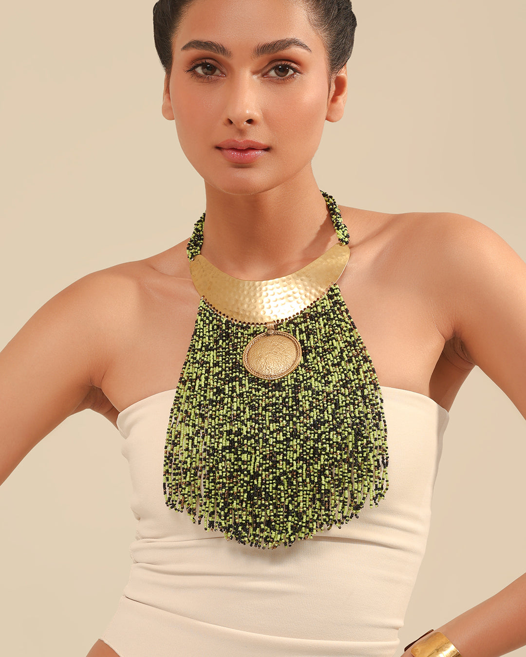 Each neck piece in this collection is a dialogue between heritage and modernity. Designed with traditional artistry, they feature exquisite pachi, kundan, and polki work, adorned with various semi-precious stones. Every detail is gold-plated, radiating opulence while remaining versatile. Whether paired with a saree, lehenga, or Indo-western attire, these neck pieces are crafted to turn heads and anchor your look in timeless elegance.