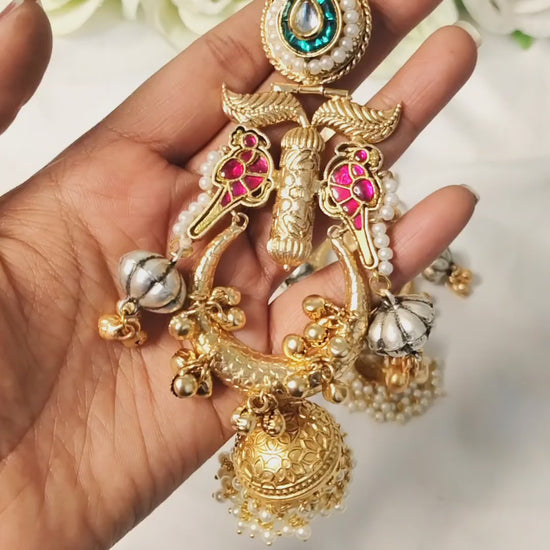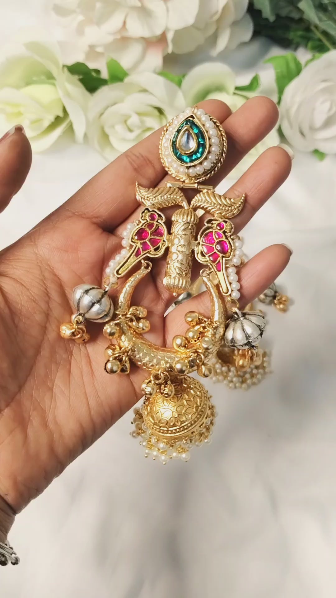 These statement earrings showcase a regal blend of gold-tone carving, vibrant semi-precious stone enamel, and a striking crescent-shaped base. The top emerald-toned stud is bordered with pearls for added grandeur. Multiple dangling beads and a detailed jhumka enhance movement and richness. Made from high-quality metal with fine enamel work, they deliver luxury, durability, and standout festive elegance.