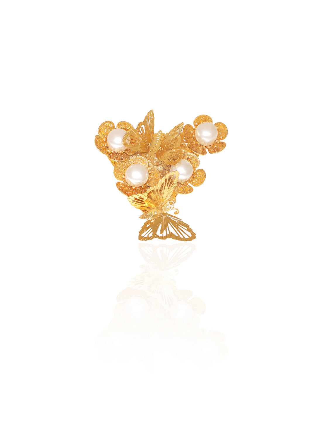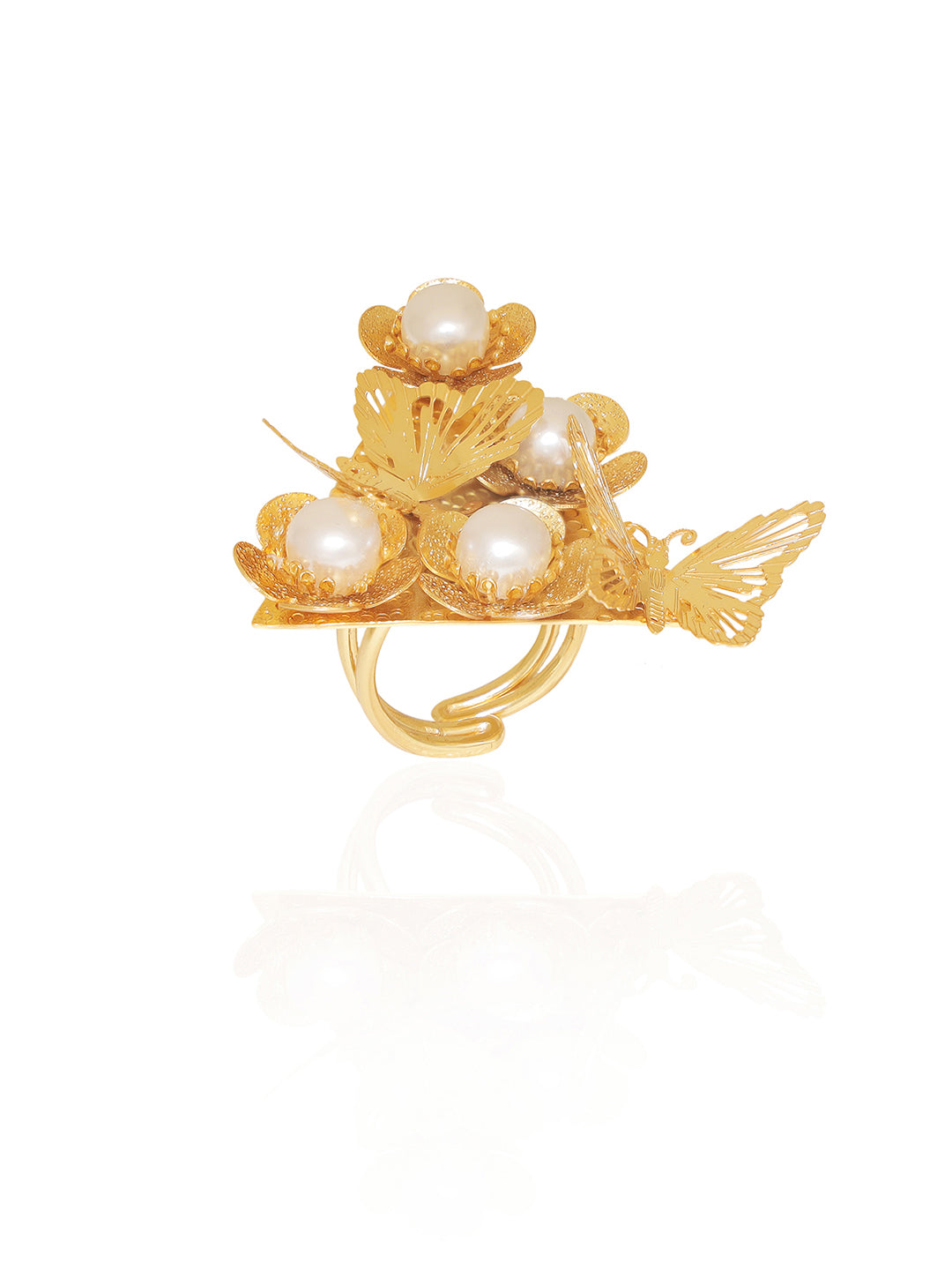 A ring that will make people remember you and your glamorous style. Rings-a-bell, doesn’t it? Ring-a-bee ring is a unique design composed of pearls, florets and butterfly motifs - finished in gold plating for that premium experience. This design is size-inclusive and comes with an adjustable ring.