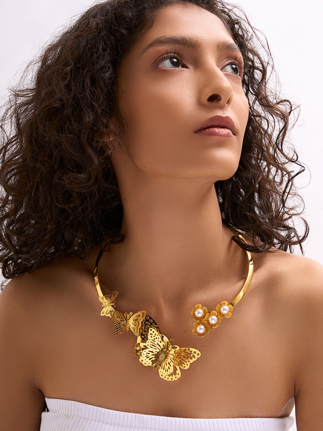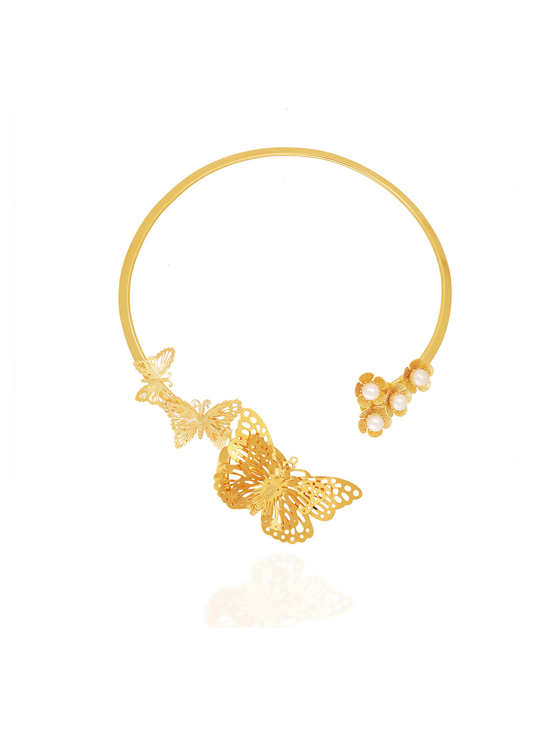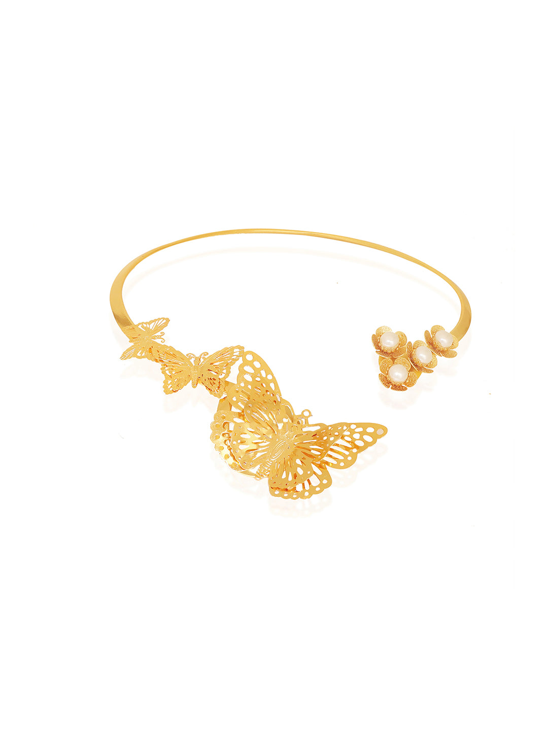 The See me Bee necklace brings to life the extraordinary beauty of nature’s elements through intricate design and fine craftsmanship. Gleaming in gold plating and reflecting light through the butterfly motifs, it makes for the perfect statement necklace for you to stand out. Pearls top it off perfectly for the added oomph.