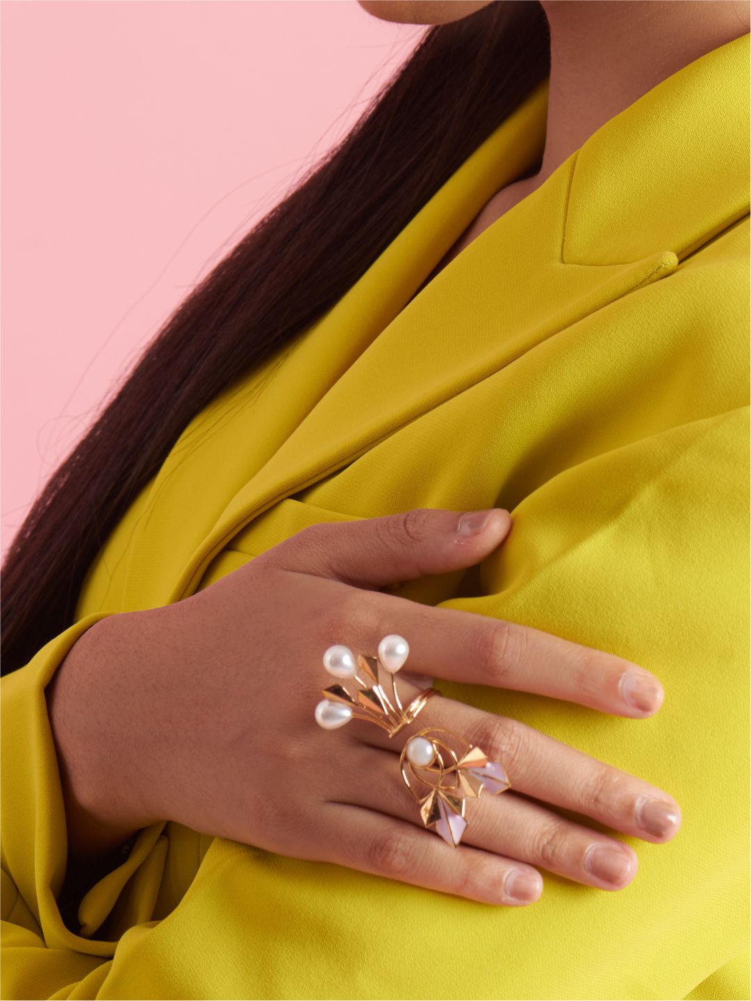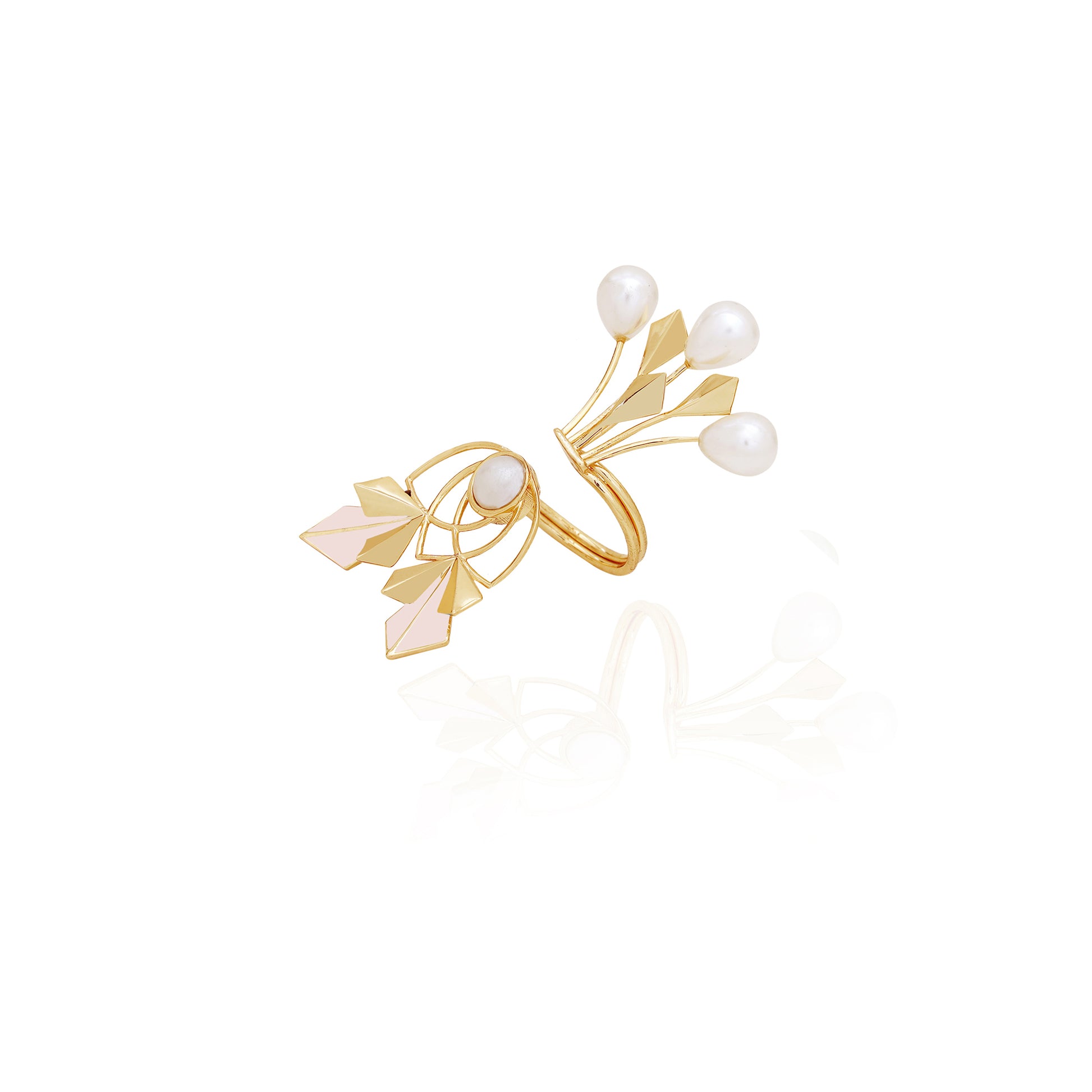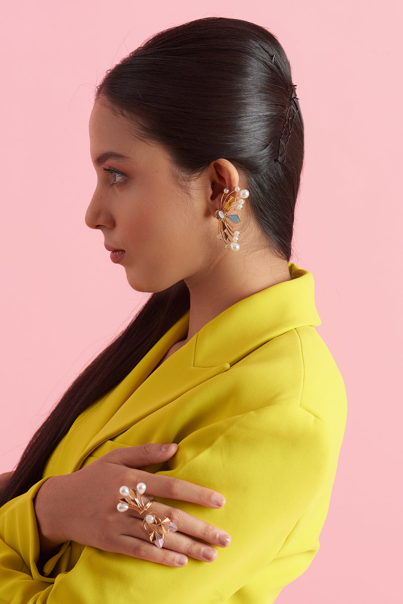 The True Beauty With The Element Of RUHHEITE's Elegant Yet Bold Sinna Pearl Graces You With Moon Charm. 22K Gold Finish, Rodium Polish, Colour Enabling With Tier Drop Pearls And Mirror In The Center. It’s Chic, Fashionable, And Styles. Crafted In RUHHEITE's Handmade Artistry. Best For Evening Contemporary Craze.