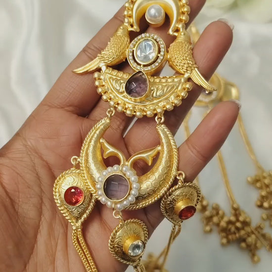 Sitara Earrings feature a radiant top accented with a polished stone and framed by finely carved wings. The mid-section showcases crescent-inspired motifs set with multiple stones, adding layered brilliance. Long fluid tassels end in clustered droplets, creating dramatic movement. This design blends celestial shapes, intricate detailing, and sparkling elements for a festive, statement-ready look.