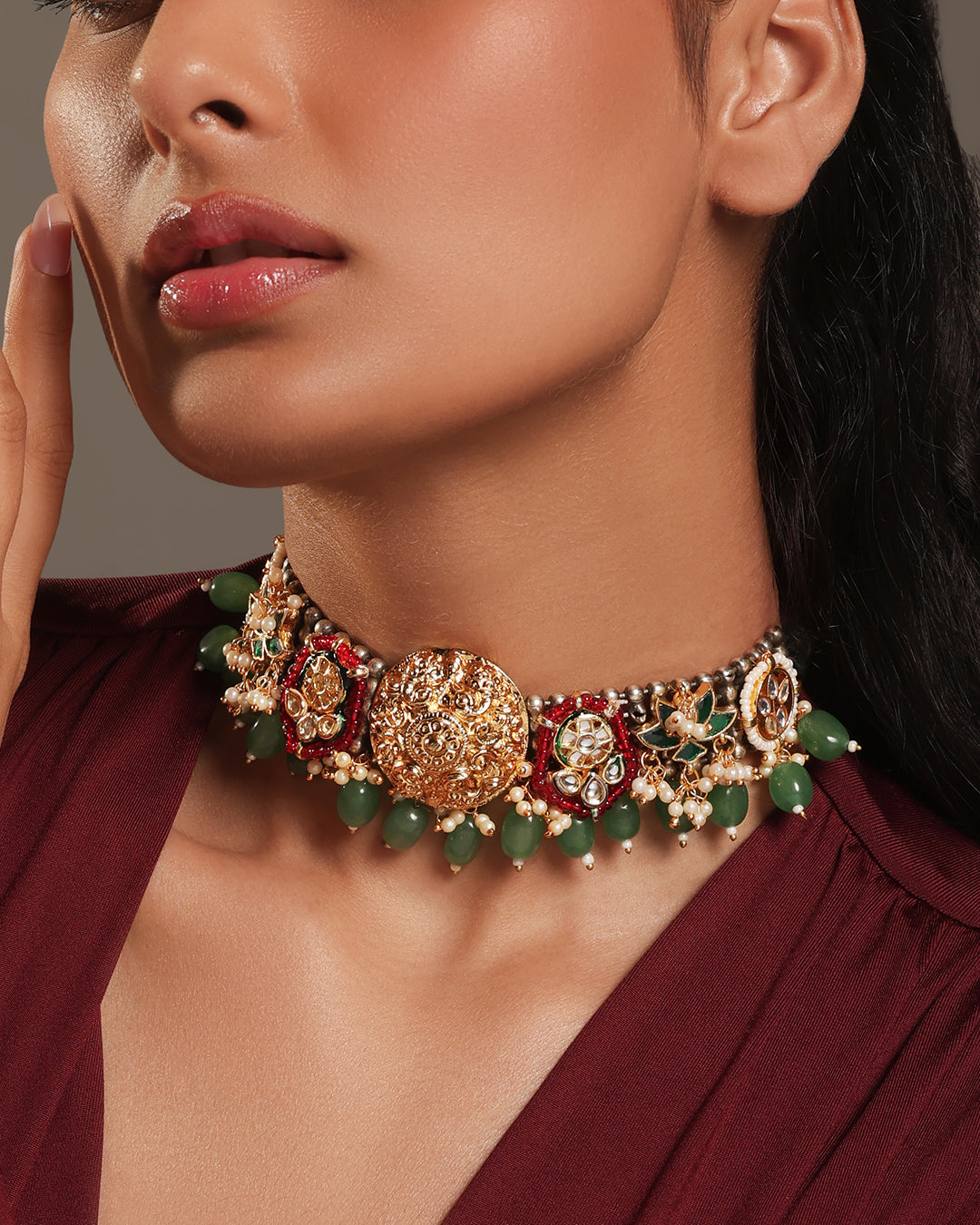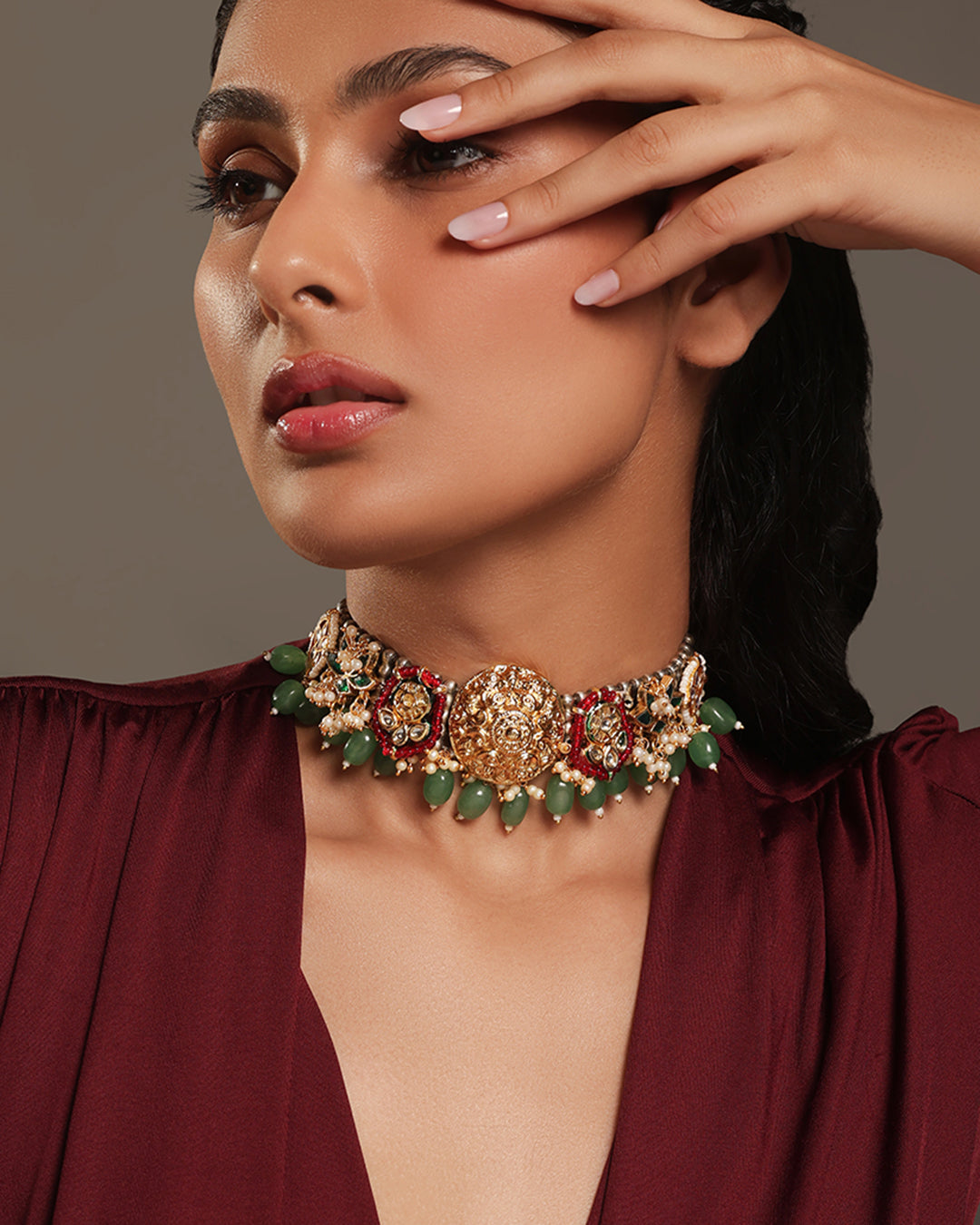 Each neck piece in this collection is a dialogue between heritage and modernity. Designed with traditional artistry, they feature exquisite pachi, kundan, and polki work, adorned with various semi-precious stones. Every detail is gold-plated, radiating opulence while remaining versatile. Whether paired with a saree, lehenga, or Indo-western attire, these neck pieces are crafted to turn heads and anchor your look in timeless elegance.