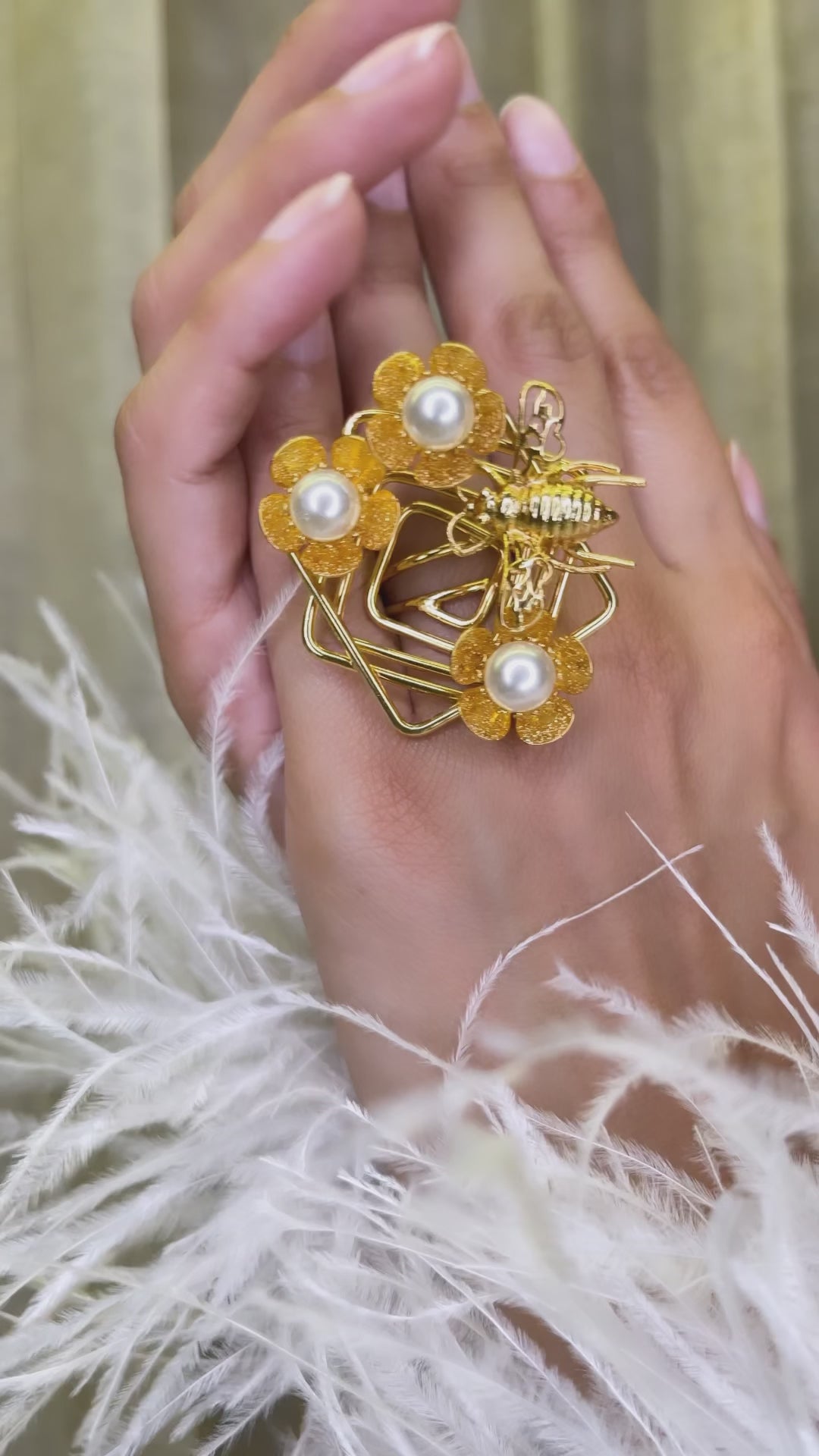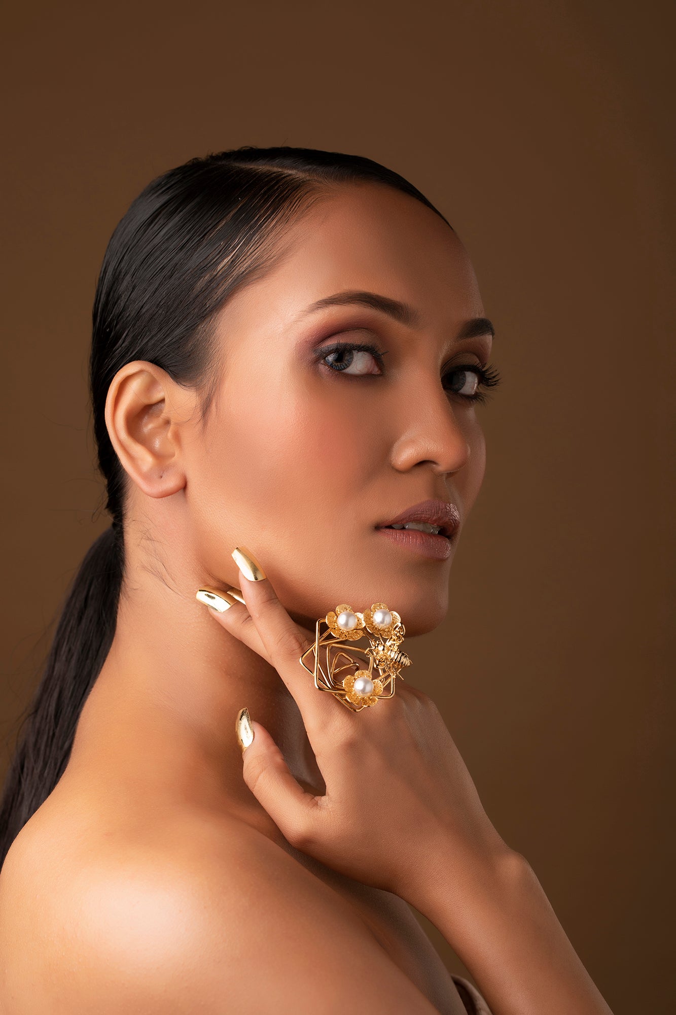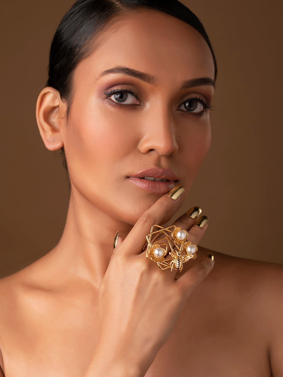 Instilled with love, the Stellar ring is surreal to look at. Its exquisite design is brought to life through prepossessing pearls and gold-chromed elements.