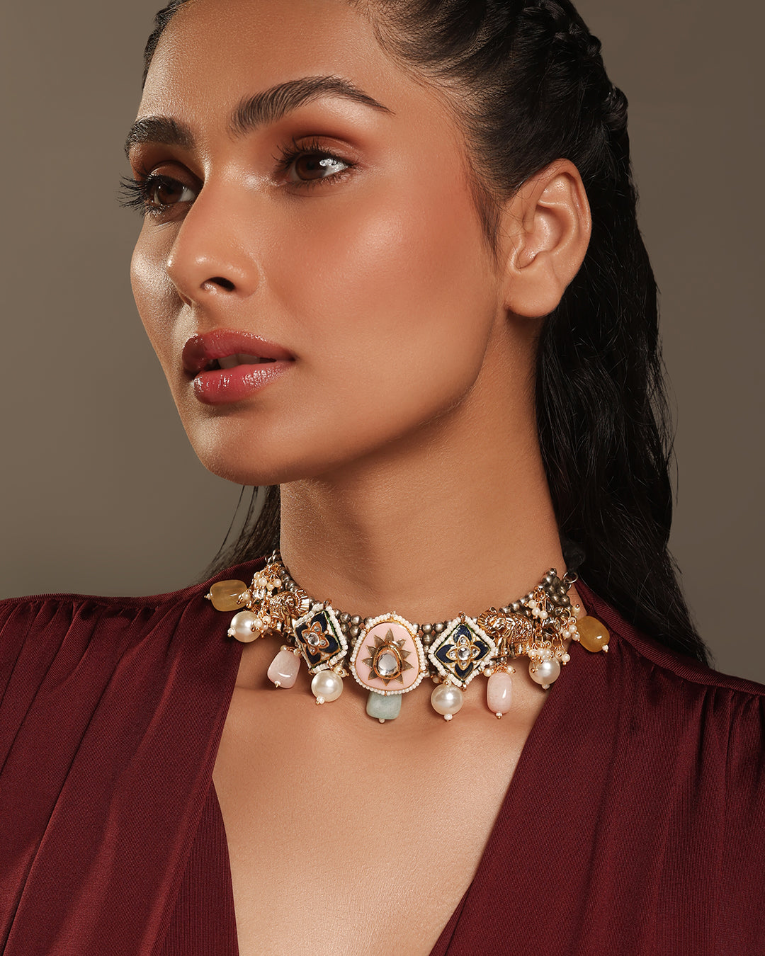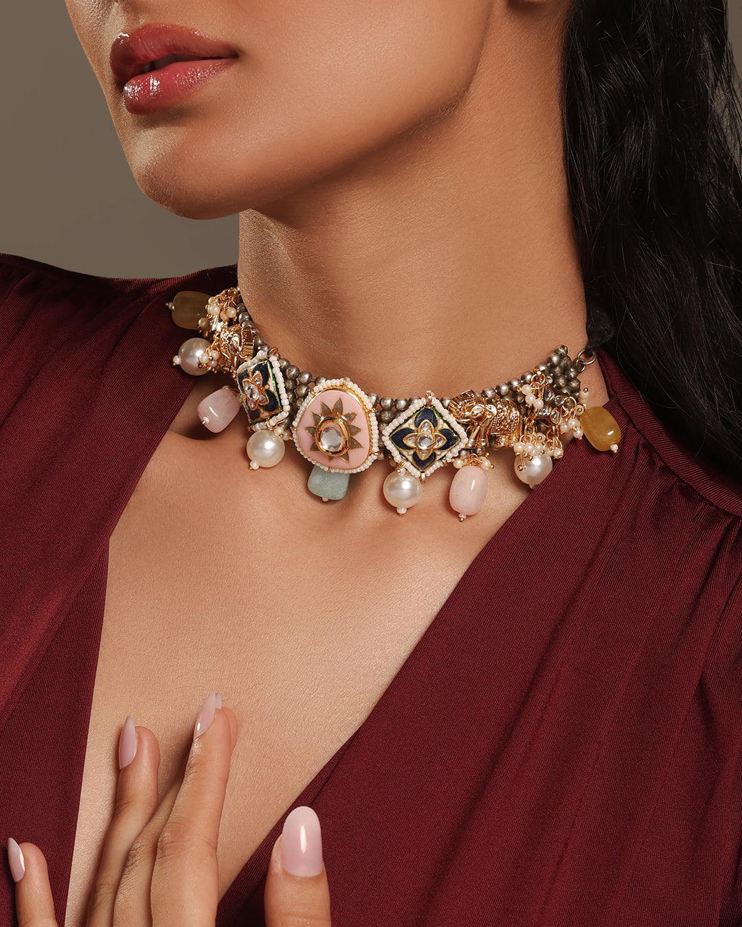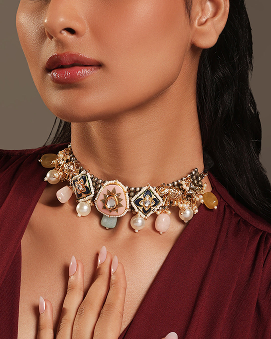 Each neck piece in this collection is a dialogue between heritage and modernity. Designed with traditional artistry, they feature exquisite pachi, kundan, and polki work, adorned with various semi-precious stones. Every detail is gold-plated, radiating opulence while remaining versatile. Whether paired with a saree, lehenga, or Indo-western attire, these neck pieces are crafted to turn heads and anchor your look in timeless elegance.