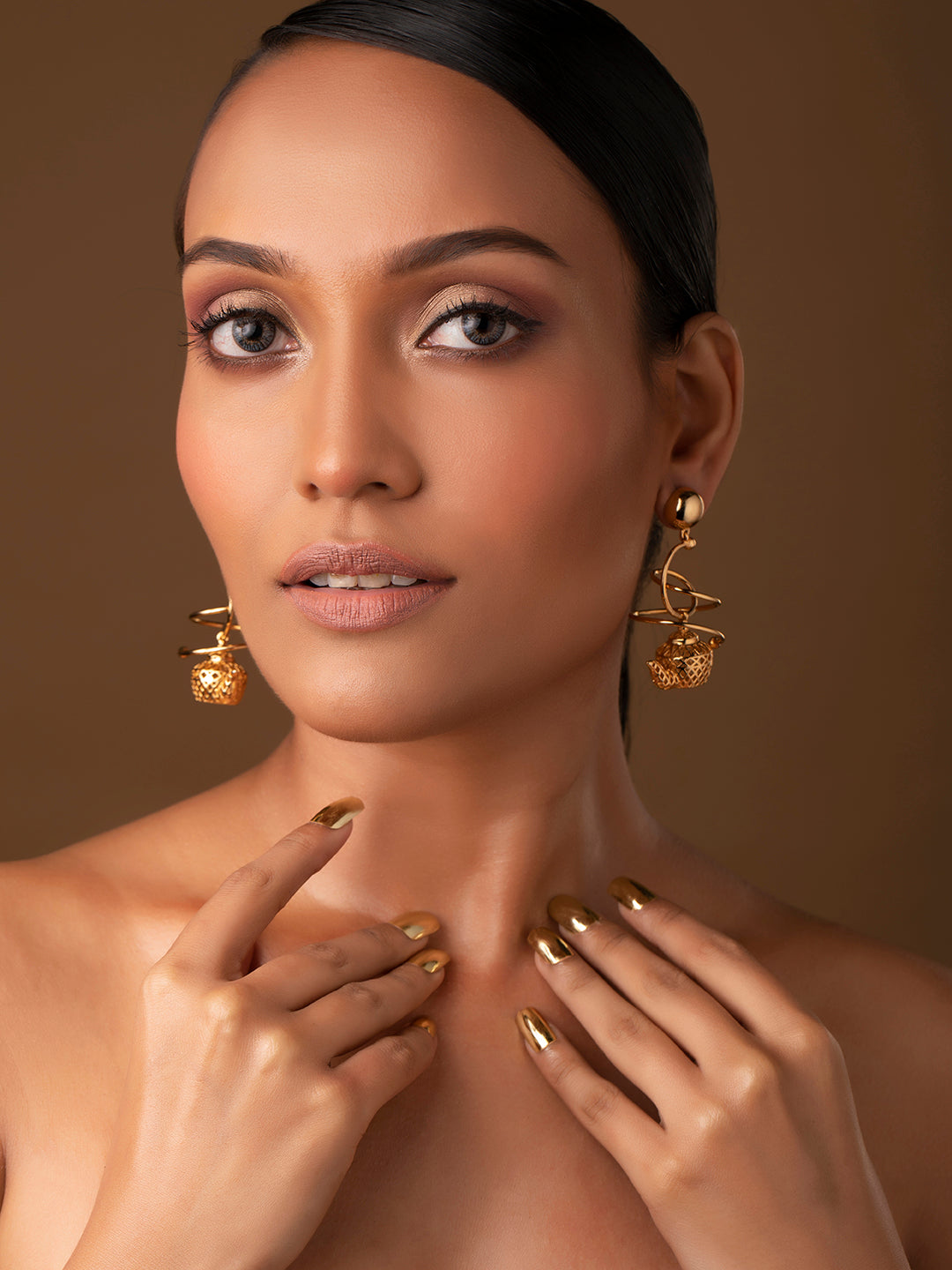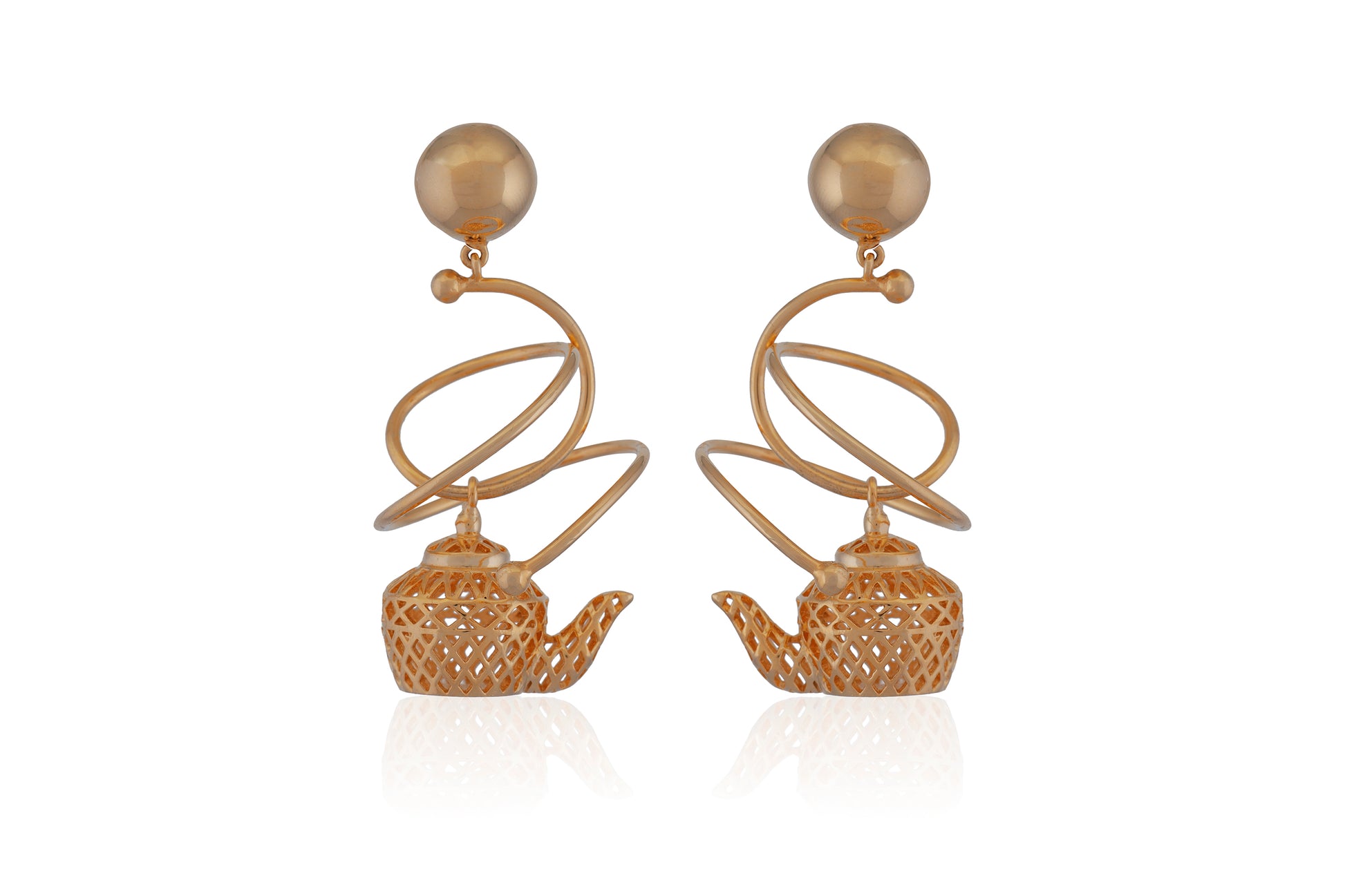 With cutesy teapot droops at the bottom of these exquisite earrings, these earrings not only promise to elicit your style, but your mood too! Finished in 22k gold plating, the tiny teapot earrings feature cyclonic waves that are capable of leaving you awestruck. An epitome of minimalistic charisma, these earrings showcase an unconventional design for the modern and contemporary #WomenOfRuhheite.
