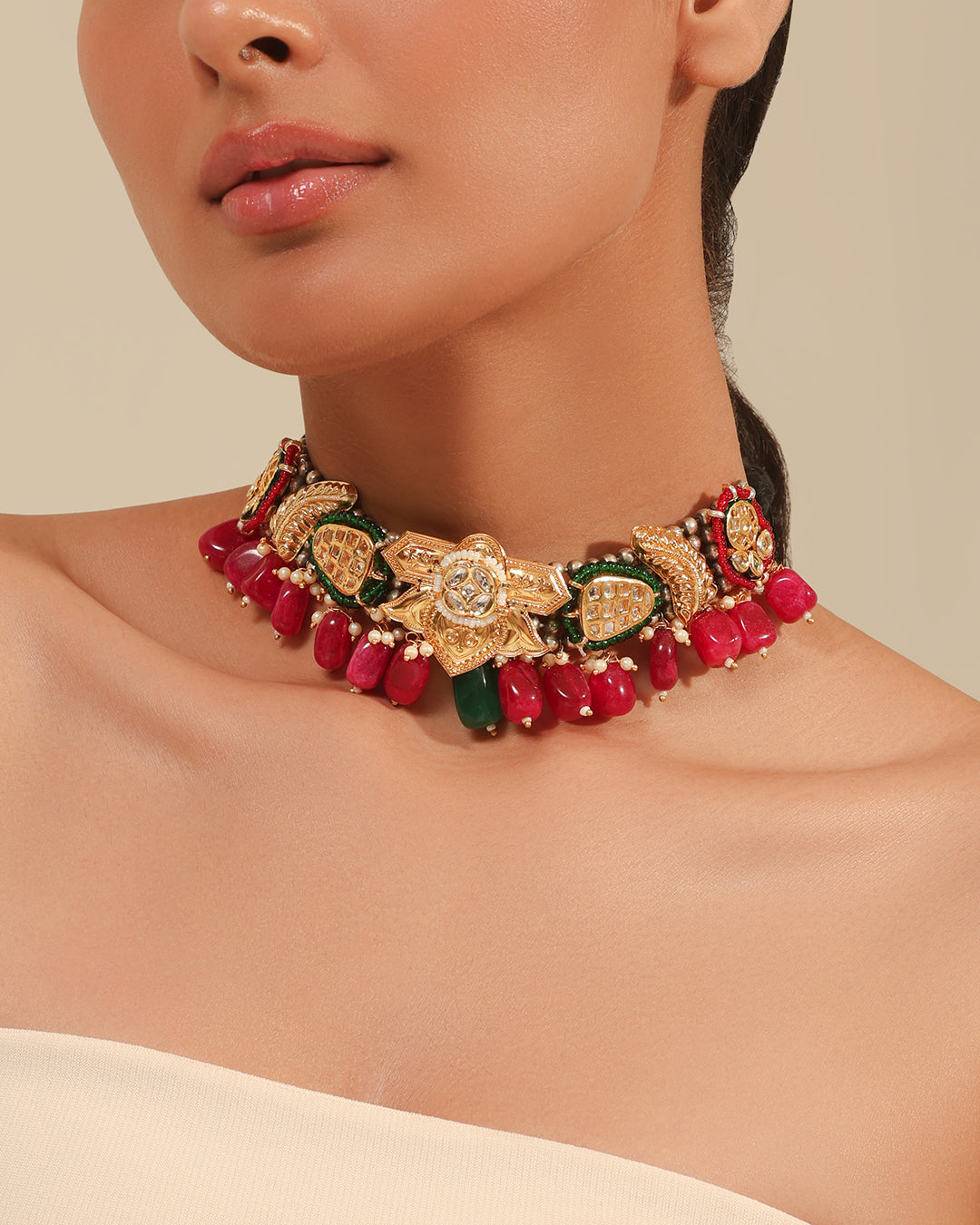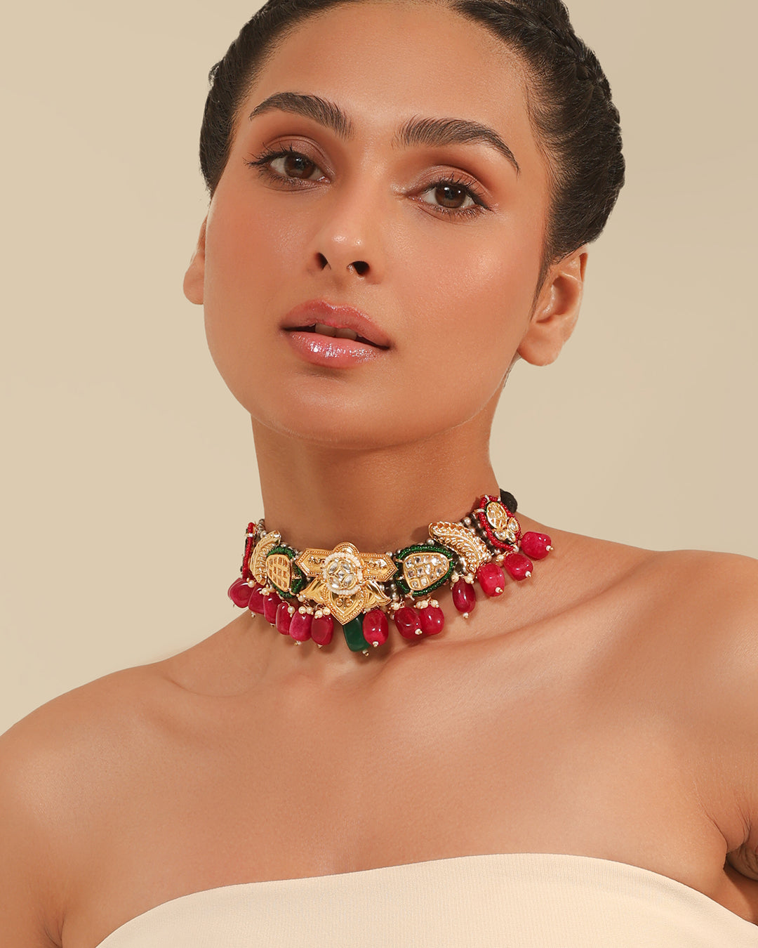 Each neck piece in this collection is a dialogue between heritage and modernity. Designed with traditional artistry, they feature exquisite pachi, kundan, and polki work, adorned with various semi-precious stones. Every detail is gold-plated, radiating opulence while remaining versatile. Whether paired with a saree, lehenga, or Indo-western attire, these neck pieces are crafted to turn heads and anchor your look in timeless elegance.