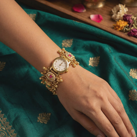 Royal Heritage Watch crafted with traditional ghughroo detailing and intricate ethnic design, giving a rich and elegant look. Perfect for weddings and festive wear, this statement timepiece beautifully blends classic tradition with modern style. A must-have royal accessory for special occasions.